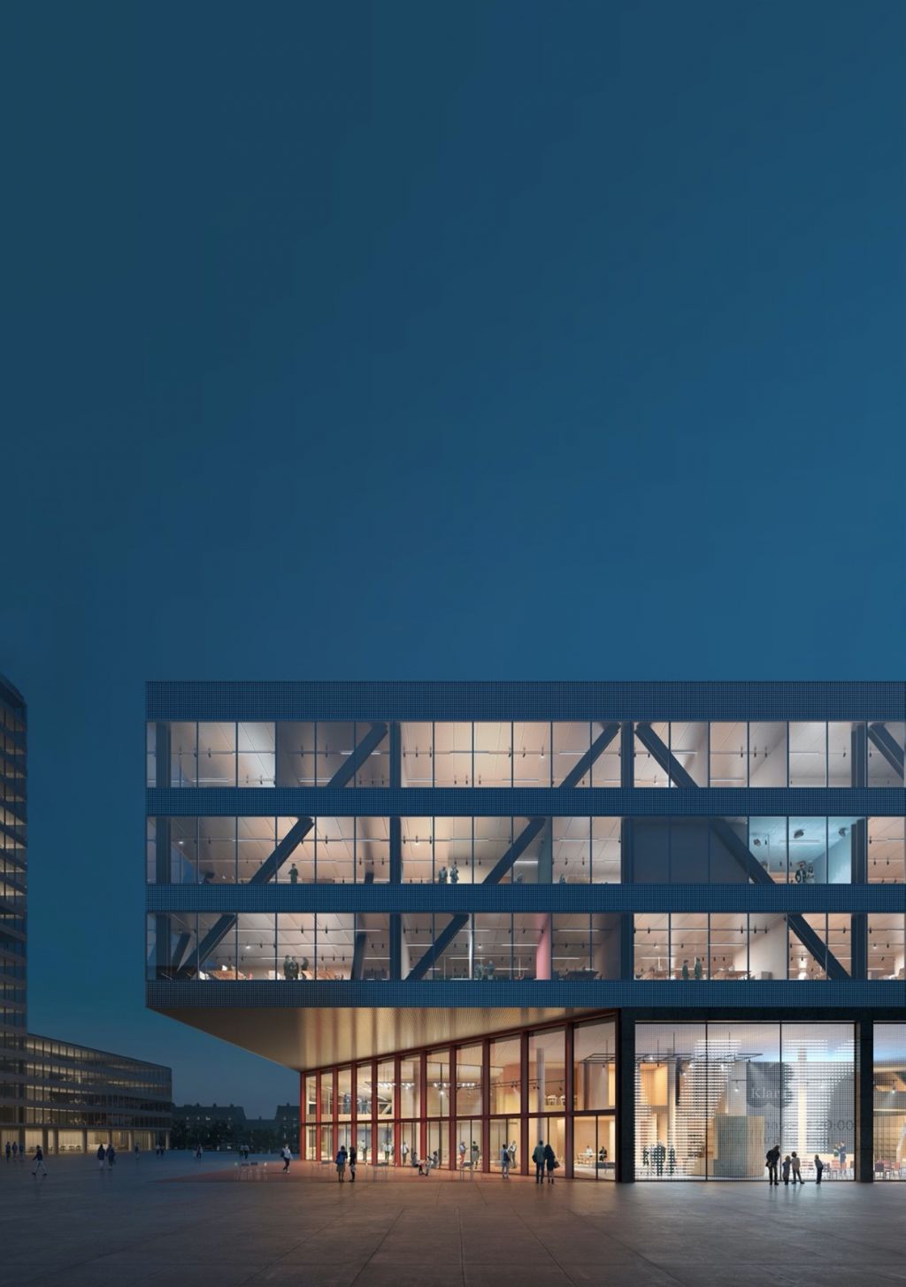 Kersten Geers (Architect, OFFICE Kersten Geers David Van Severen): “De VRT huist binnenkort in een compact en horizontaal gebouw. Een beetje als een platgelegde VRT-toren, want het gebouw is bijna even breed als de toren nu hoog is. Dit volume is als een volledige verkaveling, een veld voor alle VRT-merken en -afdelingen. Dat mediaveld wordt gedragen door een veelzijdige basis.”
