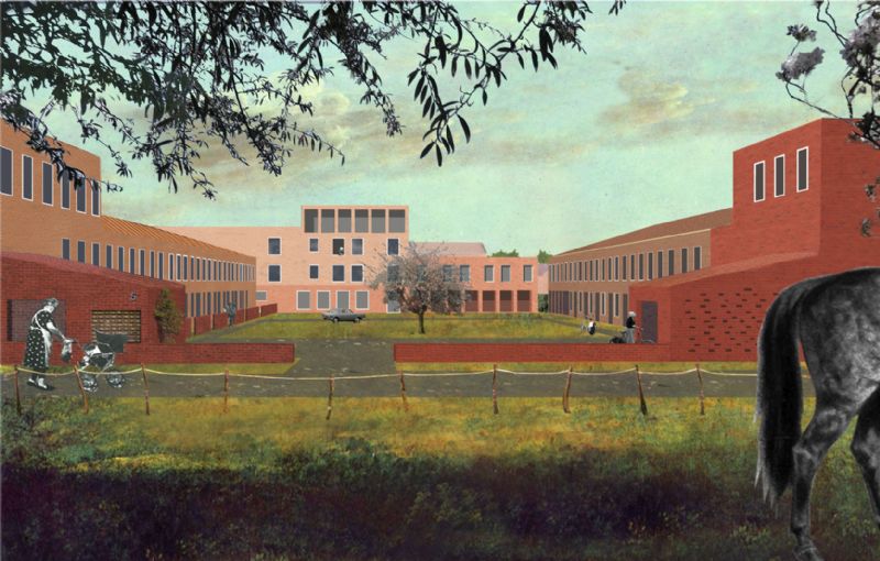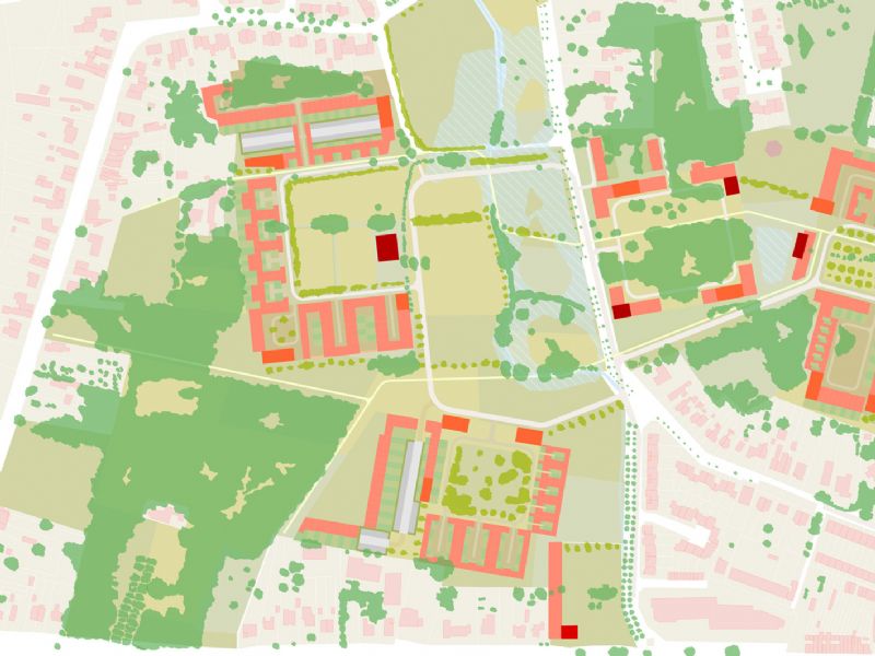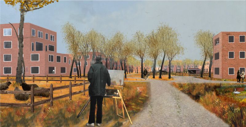 Voor de bebouwing vertrekt Bovenbouw Architectuur van een agrarisch raster van velden en bomen. Op dit raster worden nieuwe bomen aangeplant, wat leidt tot een voorsprong van het landschap op de bebouwing. Het resultaat is een robuust raster, dat op termijn ‘verstedelijkt’. Er ontstaat een evolutie van agrarische velden en bomenrijen naar landschapskamers met bebouwde randen.