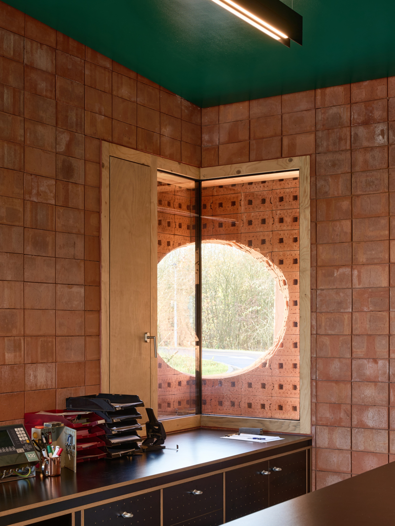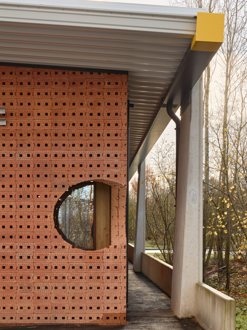 Het personeelsgebouw is opgevat als een enfilade van ruimtes die ontvangst, administratie en eetruimte met elkaar verbindt. Grote hoekramen bieden zicht op het centrale plein, waardoor toezicht en betrokkenheid vanzelfsprekend worden. Twee ronde, uitgeboorde openingen creëren diagonale zichtlijnen die bewegingen van bezoekers en voertuigen doorheen het park subtiel in beeld brengen.