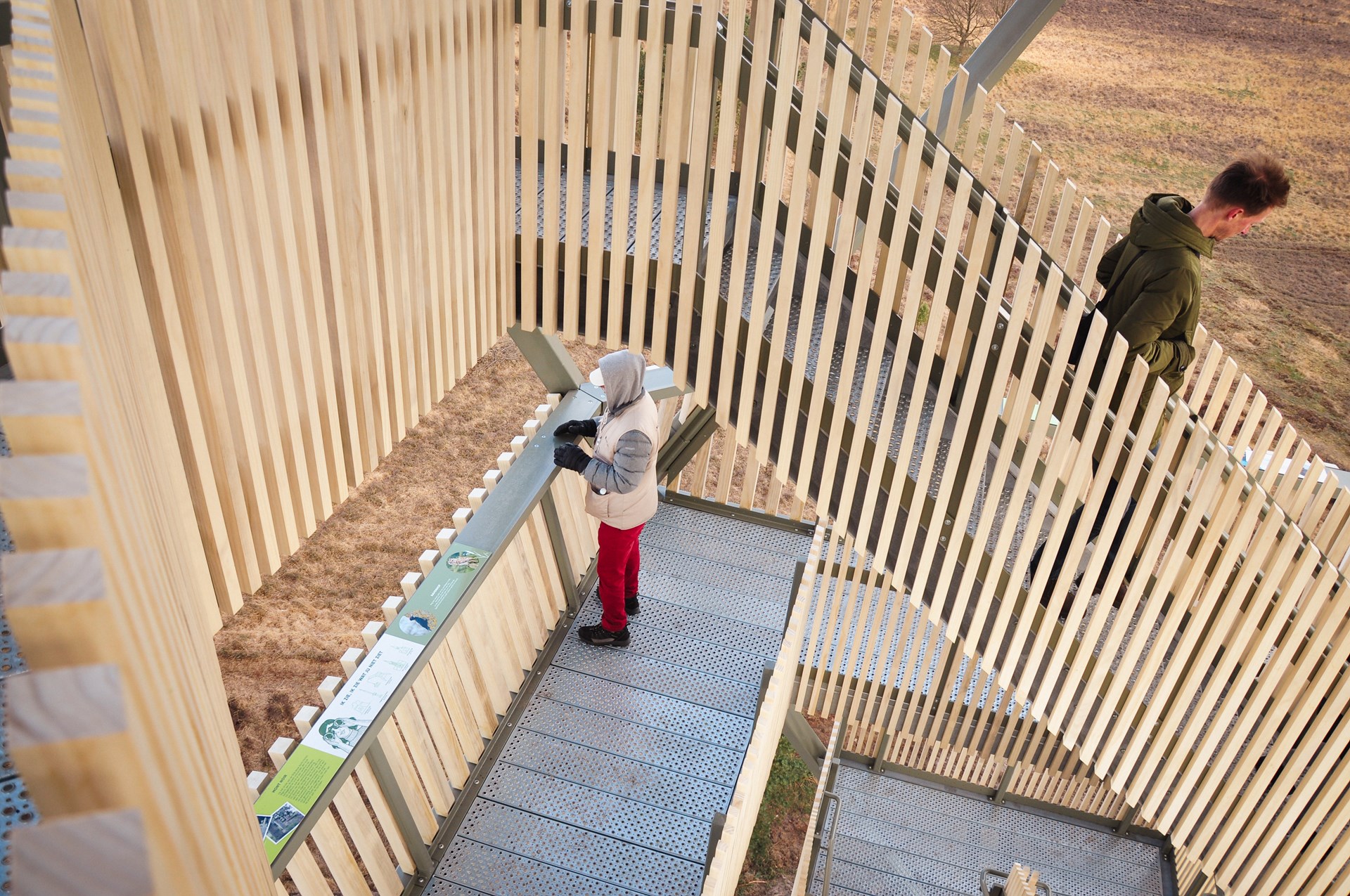 De borstweringen, balustrades en de brandwachtpost zijn afgewerkt met hetzelfde Accoya hout. Door te variëren in de dikte van de lamellen en hun onderlinge afstand, heeft de toren ondanks de grootte een verfijnde uitstraling. De kleur- en materiaalcombinatie van het hout en staal zorgt ervoor dat de toren zich goed voegt naar de natuurlijke omgeving.