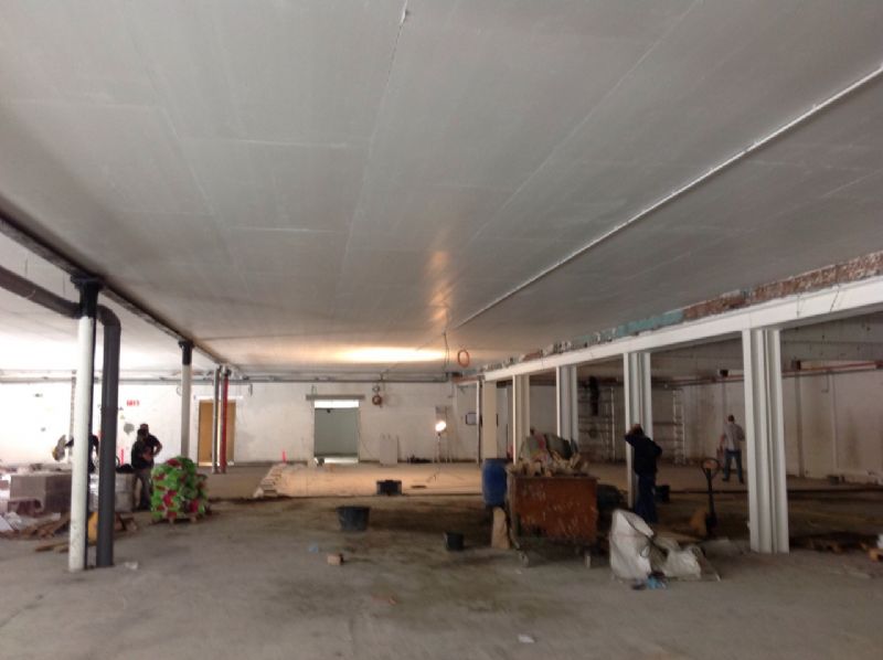 Deze constructie werd door de firma BMP building services uit Beringen geplaatst en is opgebouwd uit een speciale profielenstructuur waarop 2 lagen PROMATECT-100 platen van 10 mm zijn bevestigd. Er werd gekozen voor PROMATECT-100 platen met rechte boorden aangezien het opvoegen van de naden in dat geval niet nodig is voor het bekomen van de vereiste brandweerstand. Onder dit plafond werd nadien nog een decoratief systeemplafond gehangen.