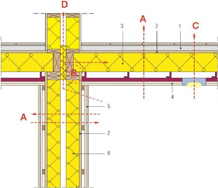 Vloer en wand REI 60 en brandvoortplatingswegen (A: directe weg, B: bezwijken van de verbindingen, C: via plaatselijke verzwakkingen en D: via de holtes)