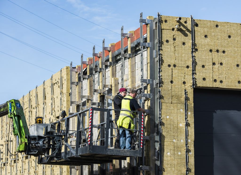 De keuze van Limeparts viel op volkern aluminium cassettes met een dikte van 3 mm. “Deze afmetingen waren voorgeschreven en het meest geschikt om dit project mee uit te voeren”, stelt Vandersmissen. De renovatie bood Limeparts ook de mogelijkheid om de gebouwen te isoleren volgens de hedendaagse normen, meer bepaald door een lichte buitenschil tegen de gevel te plaatsen. De montage bleek echter niet vanzelfsprekend. “We beginnen elk project met de montage van onze beugels”, legt Koen Vandersmissen uit. “Dat bleek in dit geval vrij complex omdat de gebouwen geen rechte wanden hebben. In de betonelementen zit een bepaalde helling, waardoor we niet op een vlakke ondergrond konden monteren. Ons werk resulteerde wel in mooie, rechte gevels.” Vervolgens werd de isolatie aangebracht, daarna de onderconstructie en daarop zijn de panelen geklikt.