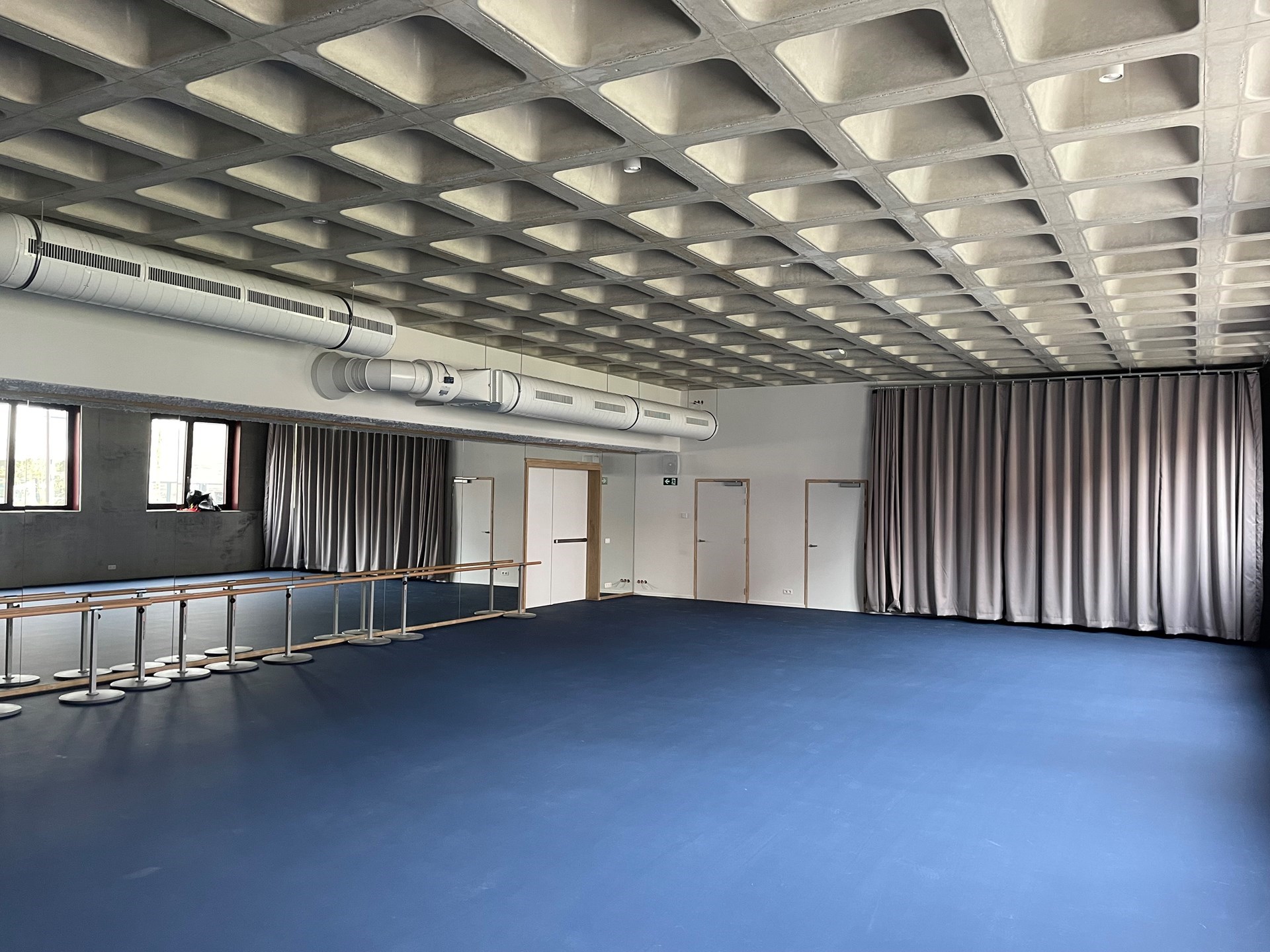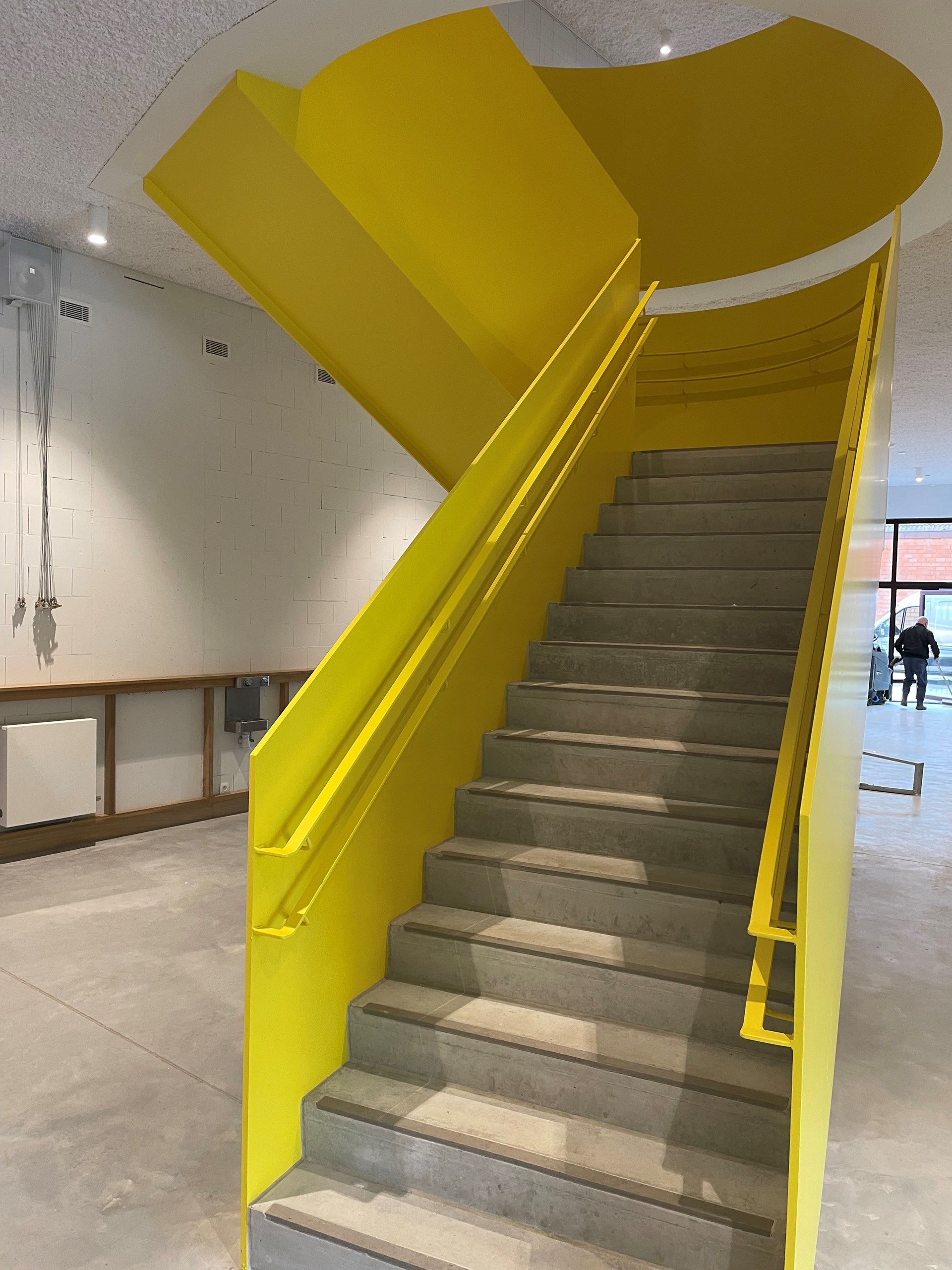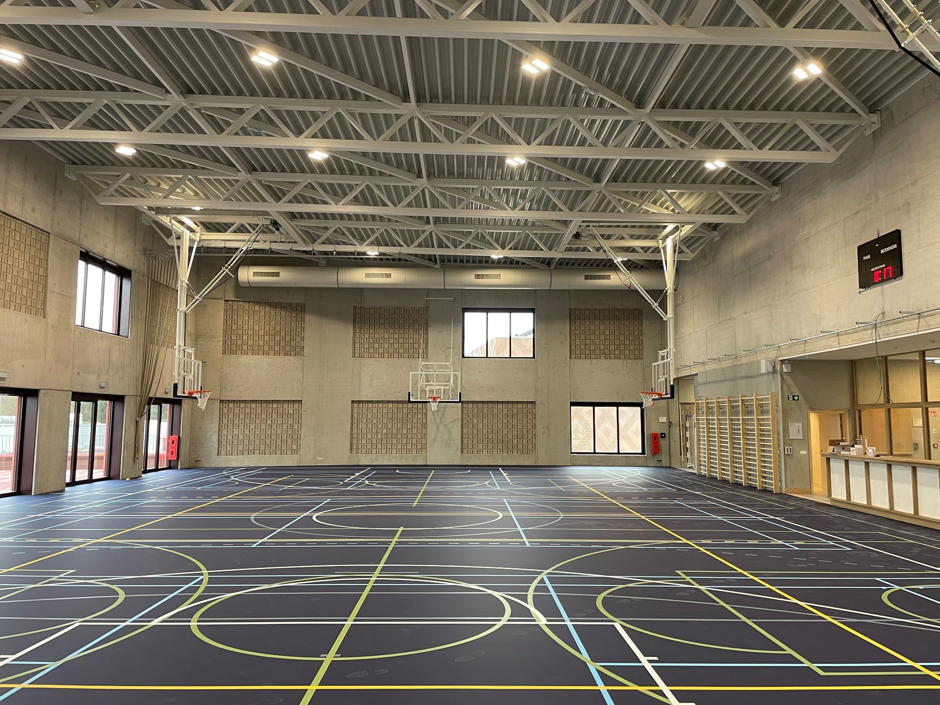 Aan esthetische uitstraling is dus geen gebrek, al bracht dit alles wel enkele bijzondere bouwkundige uitdagingen met zich mee. “Zo zijn de zichtbetonwanden in de sporthal wel 9 meter hoog. Door die grote hoogte en de complexe wapening was het geen sinecure om ze ter plaatse te storten”, vertelt Dominic Hermans, projectleider bij aannemer DCA. “De zelfdragende stalen draaitrap is enkel onder- en bovenaan in het beton verankerd. Hij werd in drie delen aangevoerd vanuit het atelier en ter plaatse aan elkaar gelast. De bekisting van de externe noodtrap was evenmin evident vanwege de driehoekige kolom. We moesten slede per slede afzonderlijk storten, waardoor het negen weken duurde om de trap af te werken. Tot slot was ook de bevestiging van de gevelelementen in architectonisch beton een delicate klus, zeker als je weet dat elk paneel gemiddeld 6 ton woog en dat we ze tot op een hoogte van 30 meter moesten plaatsen.”
