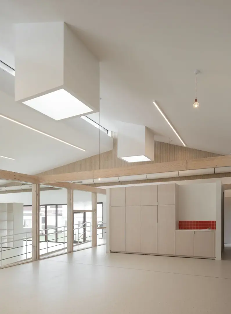 Een opvallende ingreep betreft de voormalige dagkapel. Door het dak te verwijderen en de buitenmuren te behouden, is een koer gecreëerd die dienstdoet als buitenspeelruimte en buffer naar de buurt. De aanwezige draagbalken bleven bewaard en zullen in de toekomst fungeren als ophangstructuur voor speelelementen zoals bijvoorbeeld schommels. De werkwijze, waarbij de bestaande vormentaal expressief wordt ingezet voor een nieuwe functie, biedt een methodiek voor de herbestemming van modernistisch erfgoed.