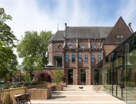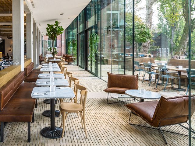 Het café heeft een ruim terras met een brede trappartij uit duurzame kleiklinkers die rechtstreeks leidt naar het park. De monumentale kapel, die oorspronkelijk versierd was met glas in lood, is in ere hersteld en wordt nu gebruikt voor bruiloften en andere festiviteiten.