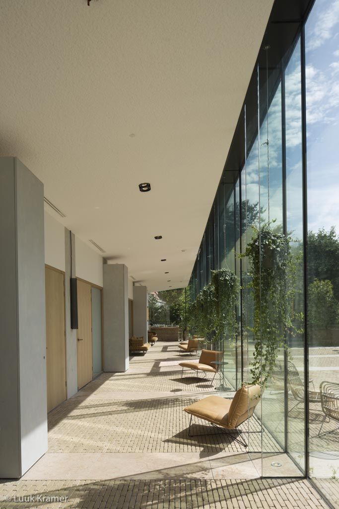 “Omdat de gevel van de twee nieuwe vleugels helemaal van glas is, wordt binnen en buiten vrijwel naadloos met elkaar verbonden. Dit wilden wij benadrukken door de bestrating van buiten letterlijk naar binnen door te trekken. Omdat de architectuur zelf zo sterk is wilden wij voorts een materiaal gebruiken dat kleinschaligheid en ‘persoonlijkheid’ toevoegt.