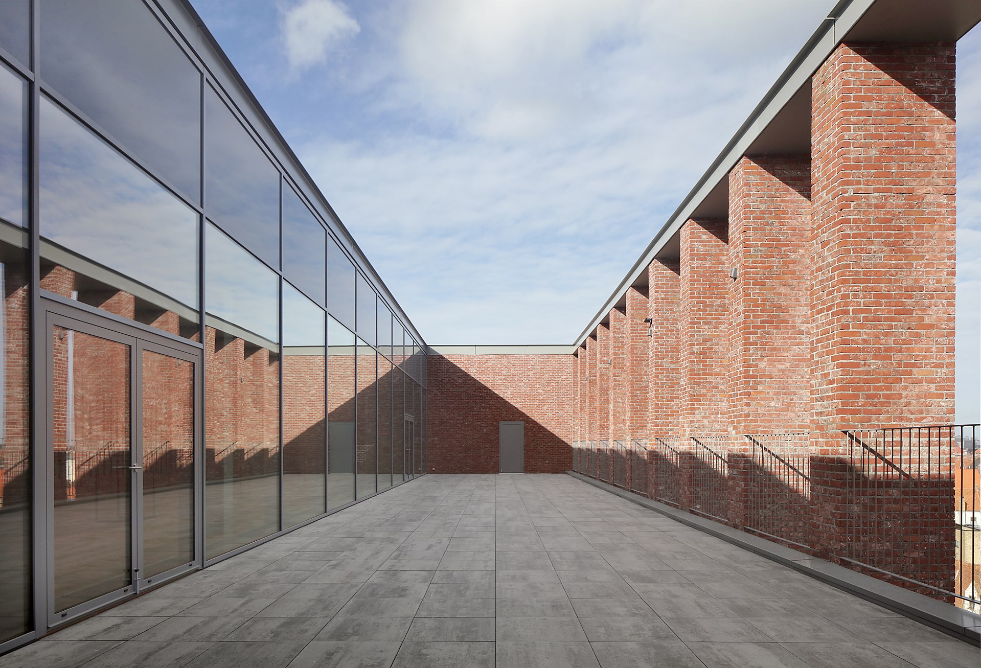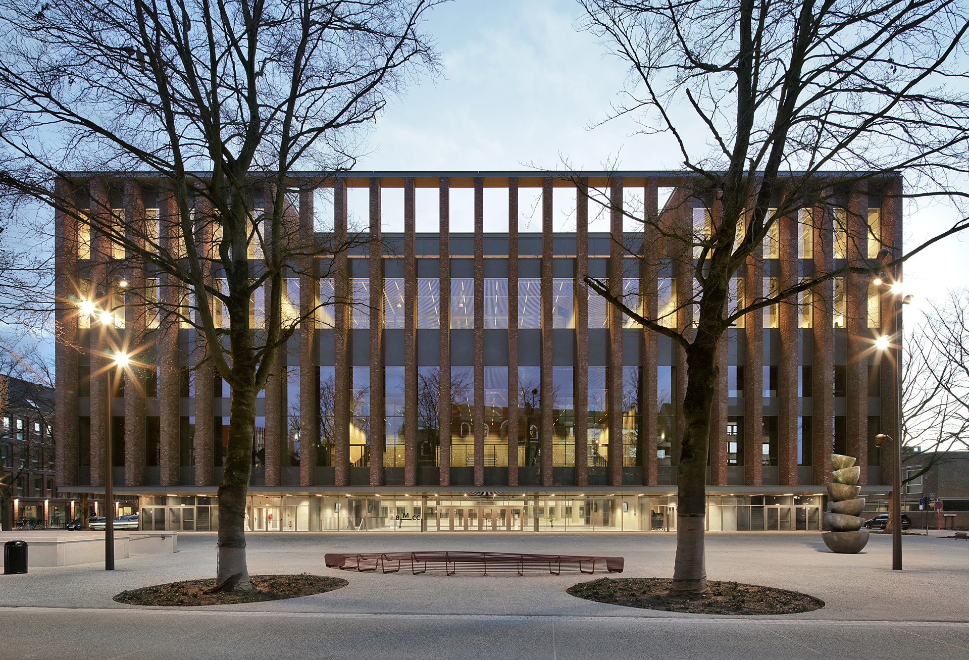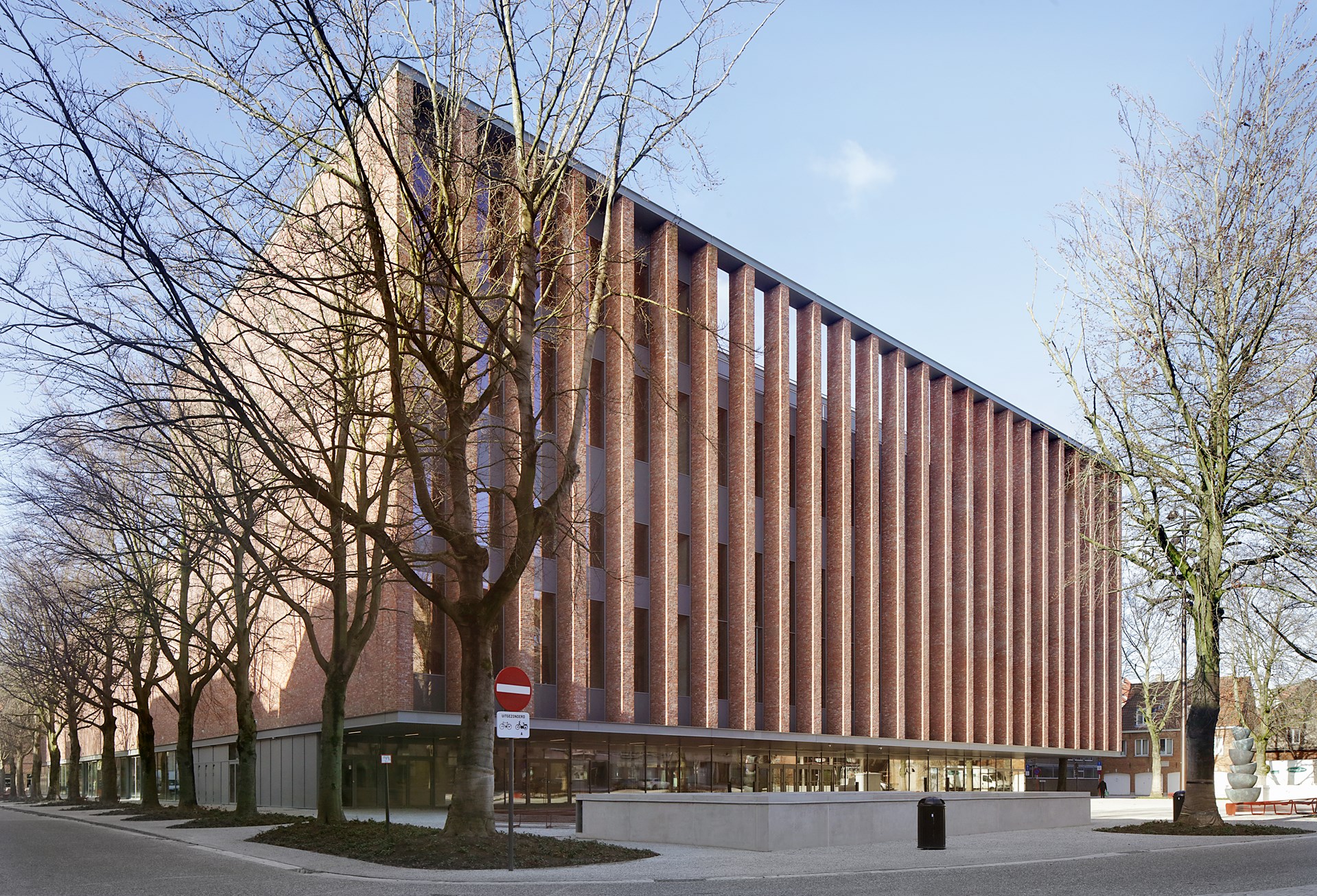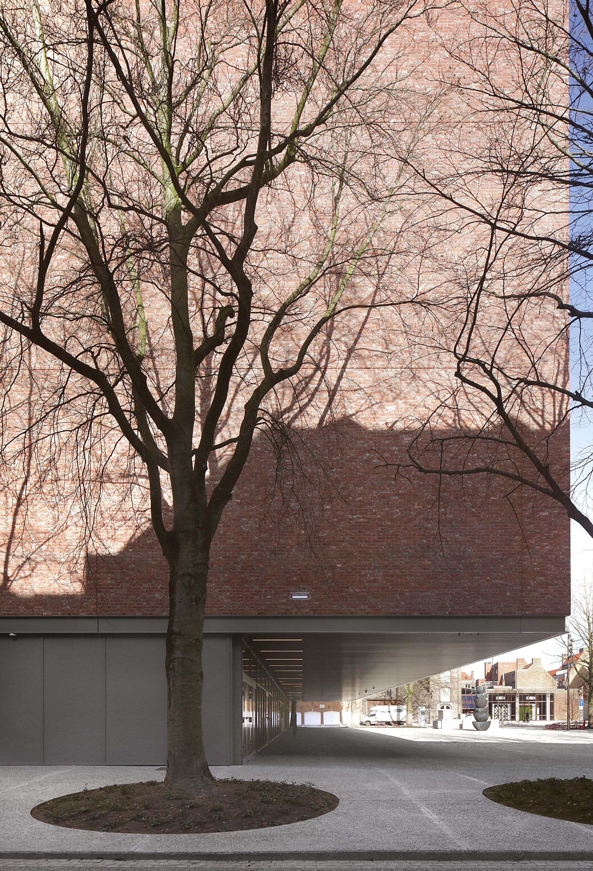 Het gebouw heeft een robuuste, massieve verschijningsvorm in roodbruine baksteen, afgestemd op het kleurenpalet van de stad. De stenen werden vol in de mortel geplaatst en met een eenvoudige afgestreken voeg verwijzen ze naar de traditionele manier van metselen. Een referentie naar het historische Brugge.