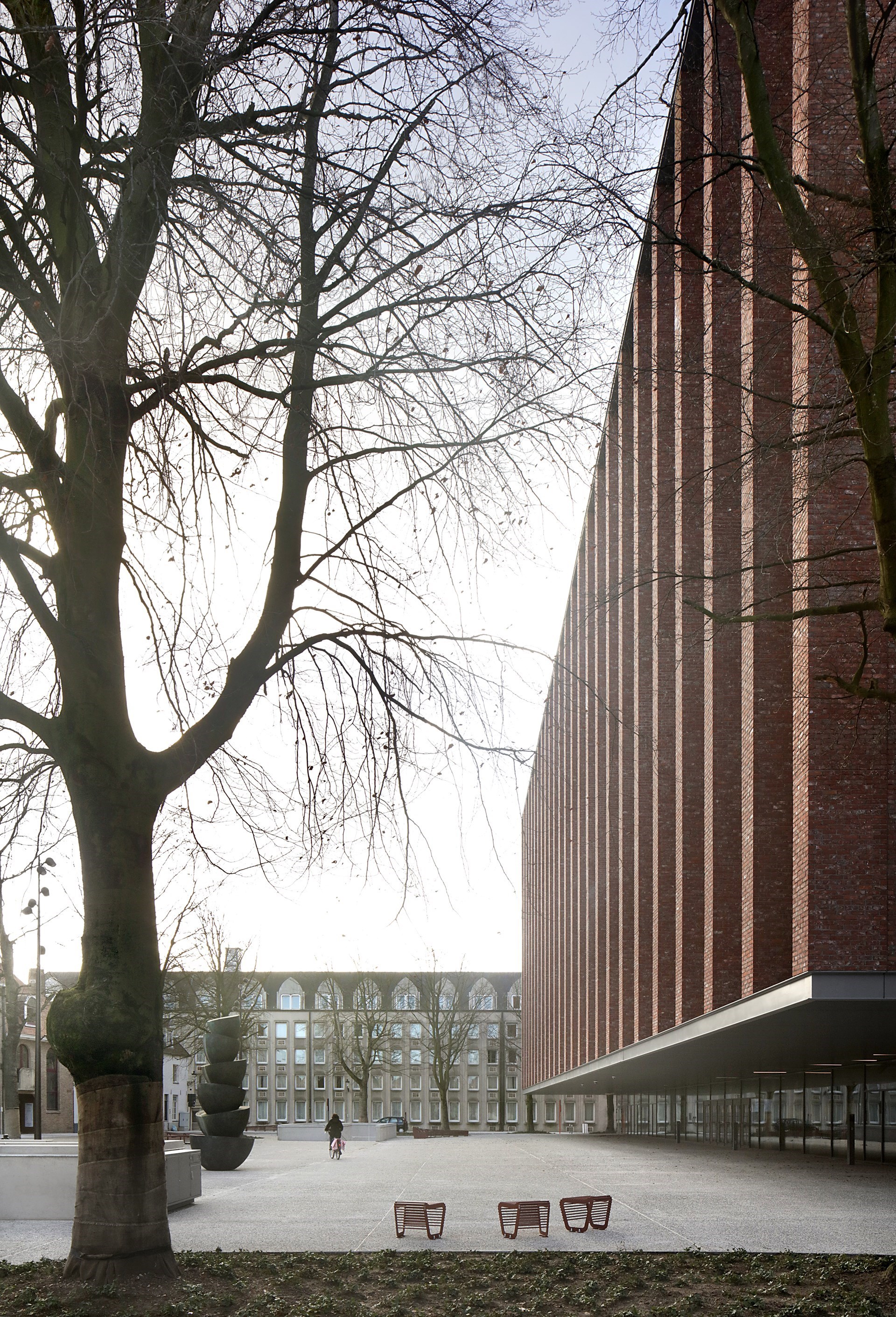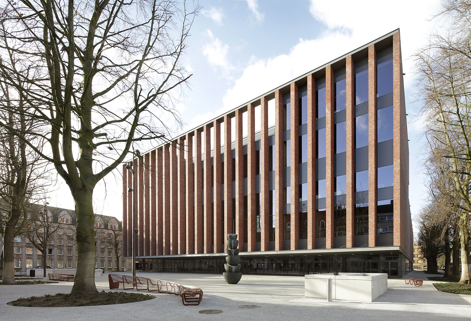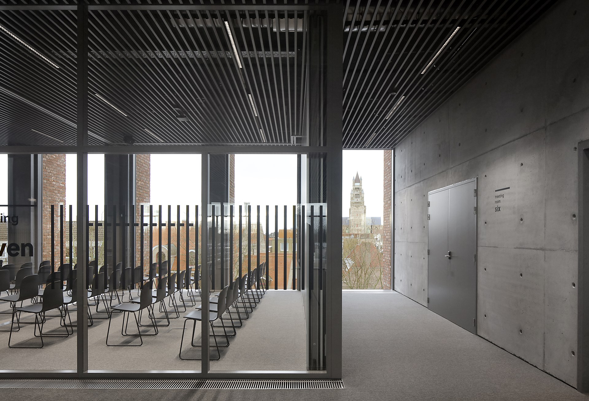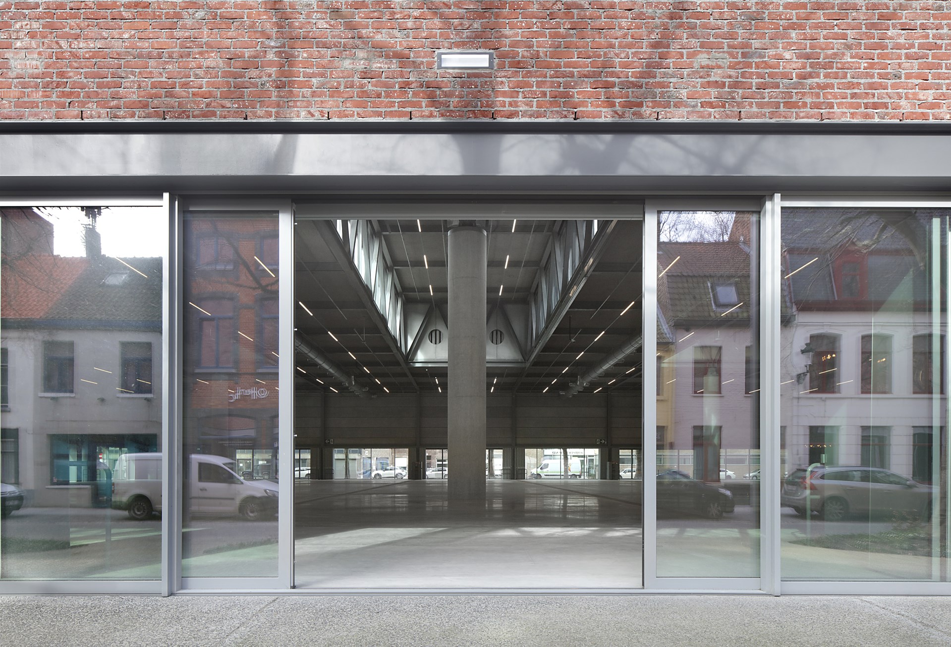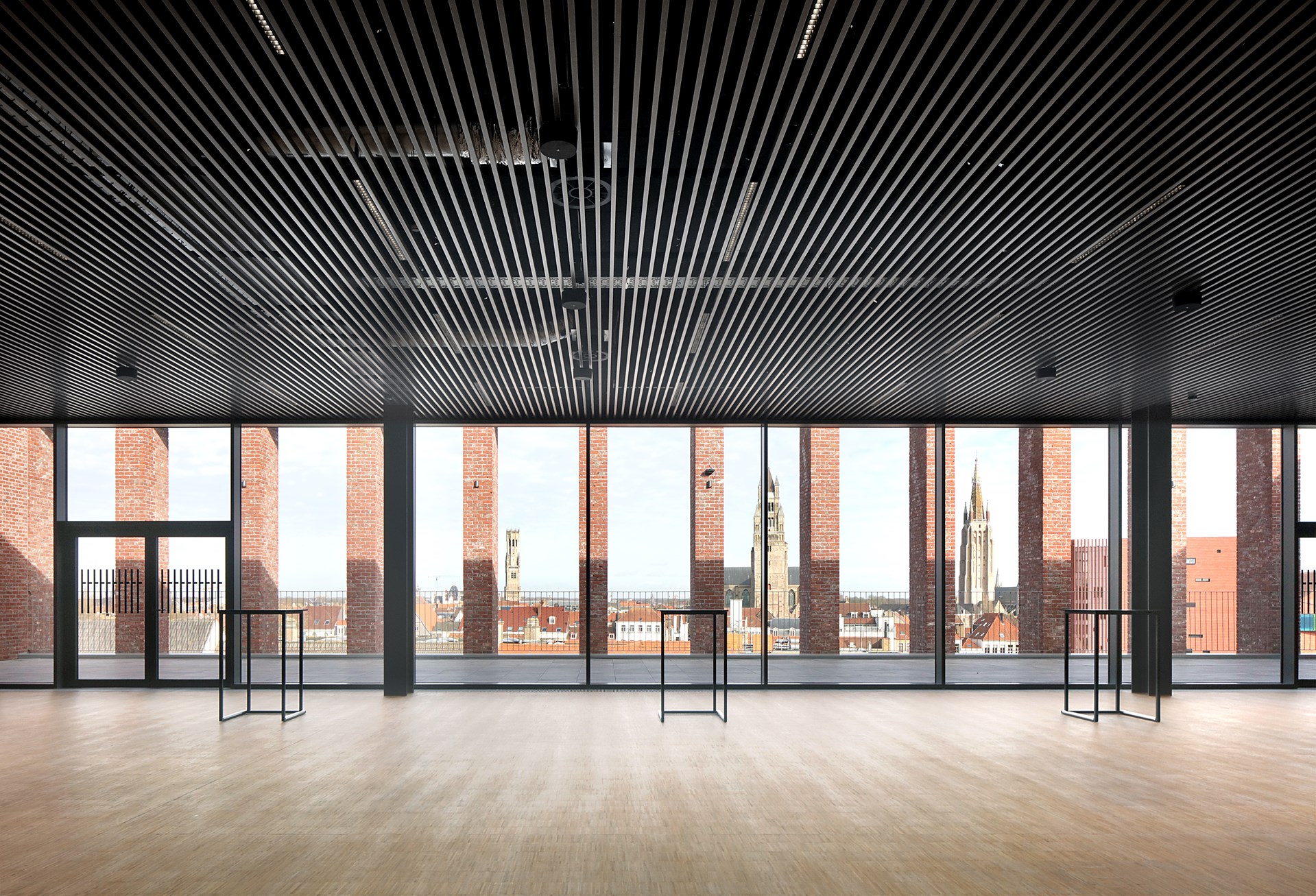 De massieve bakstenen kolommen geven de gevel een mooie cadans. Met hun solide karakter zorgen ze voor voldoende schaduw en fungeren ze als een geïntegreerde zonwering. Vanaf de tweede verdieping sturen ze het zicht van binnen naar buiten richting het centrum, waar de drie torens van het Belfort, de Sint-Salvatorskathedraal en de Onze-Lieve-Vrouwekerk de Brugse skyline kenmerken.
