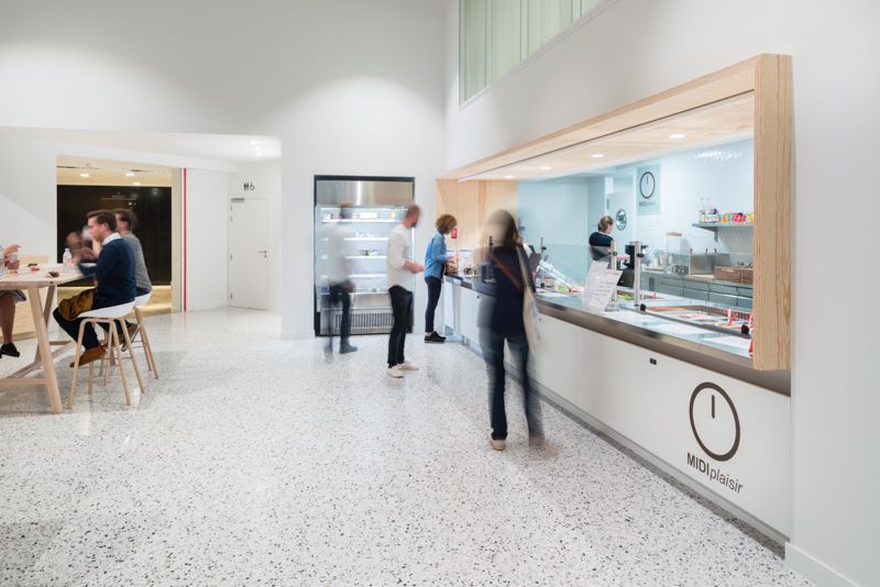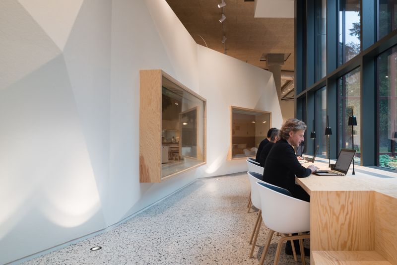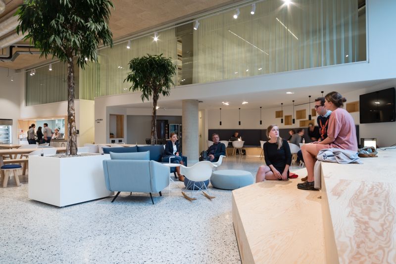 De uitdaging betond erin om daglicht zo diep mogelijk in de ruimte te brengen. Er werden lichte materialen gebruikt om de lichtreflectie optimaal te benutten. De deelzones werden zo ingericht dat ze de ruimte visueel niet compartimenteren. Op die manier laten de ontwerpers de ruimtelijke beleving van deze loungeplek maximaal tot zijn recht komen.