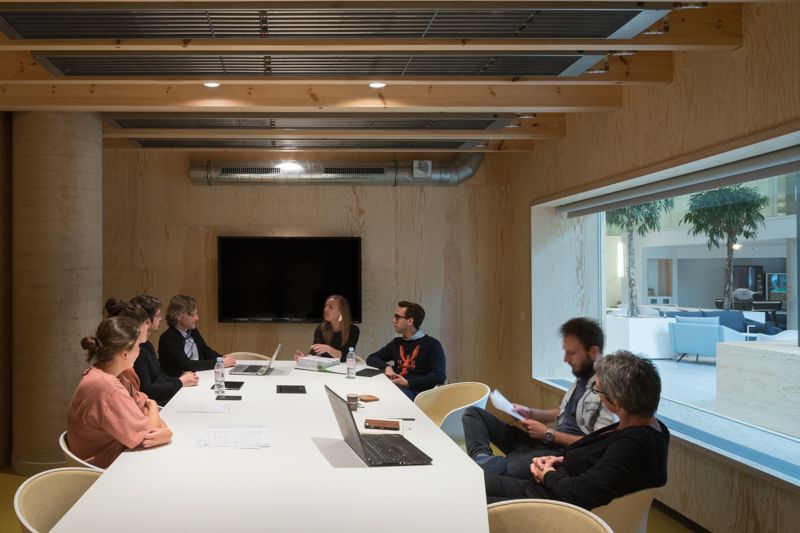 “De bestaande ruimte is twee verdiepingen hoog waardoor er voldoende hoogte aanwezig is om met het ‘box-in-box’-principe te werken", klinkt het bij de ontwerpers. “Centraal in de ruimte hebben we een organisch object ingeplant waar drie vergaderzalen zijn in ondergebracht en een loungeruimte op het dak.” Het yoga- en opleidingslokaal zijn ondergebracht in een grote mezzanine.