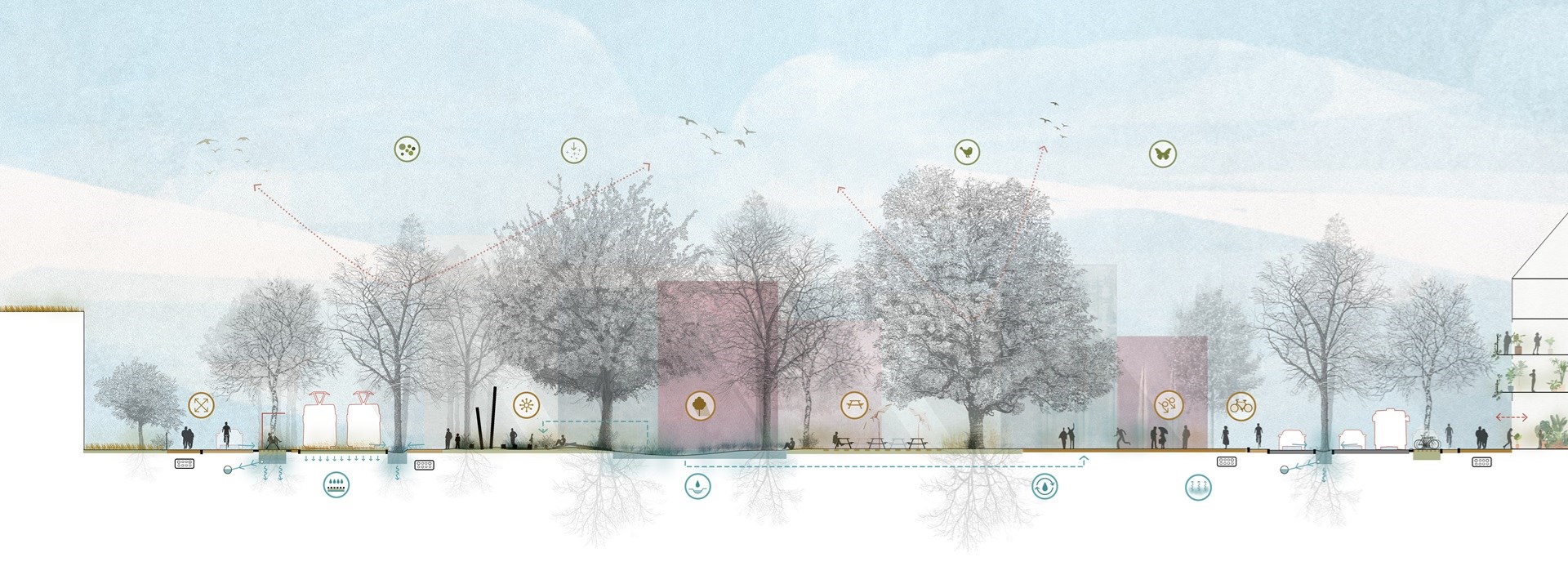 - Biodiversiteit aanwakkeren via vegetatie en bodemverbetering die fauna beschutting, veilige doorgangen en voedingen bieden.