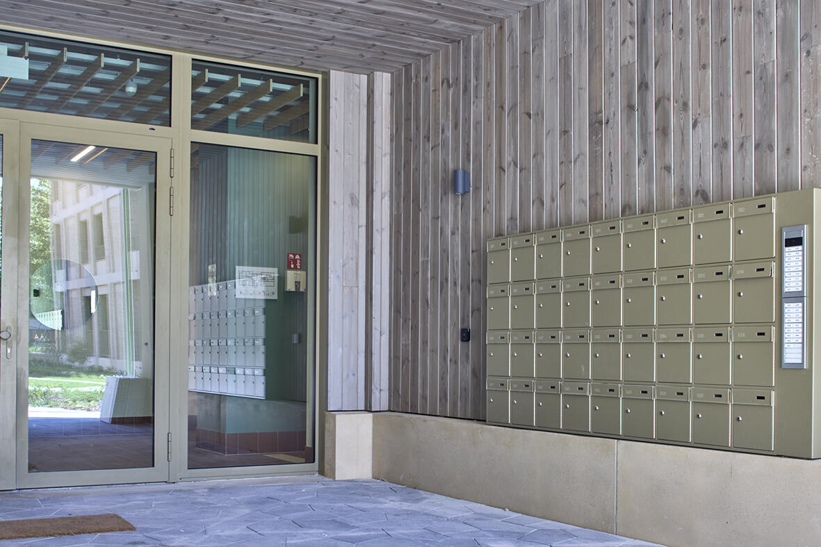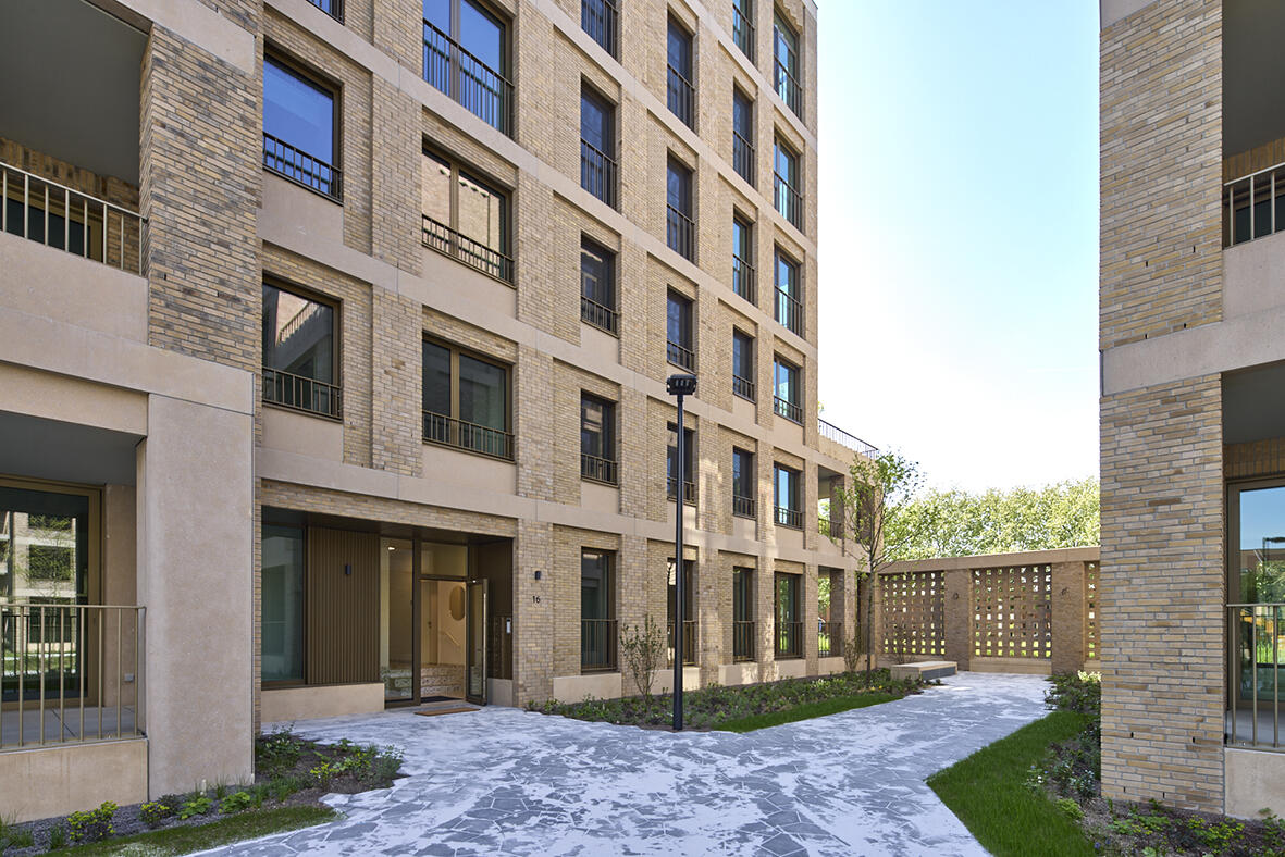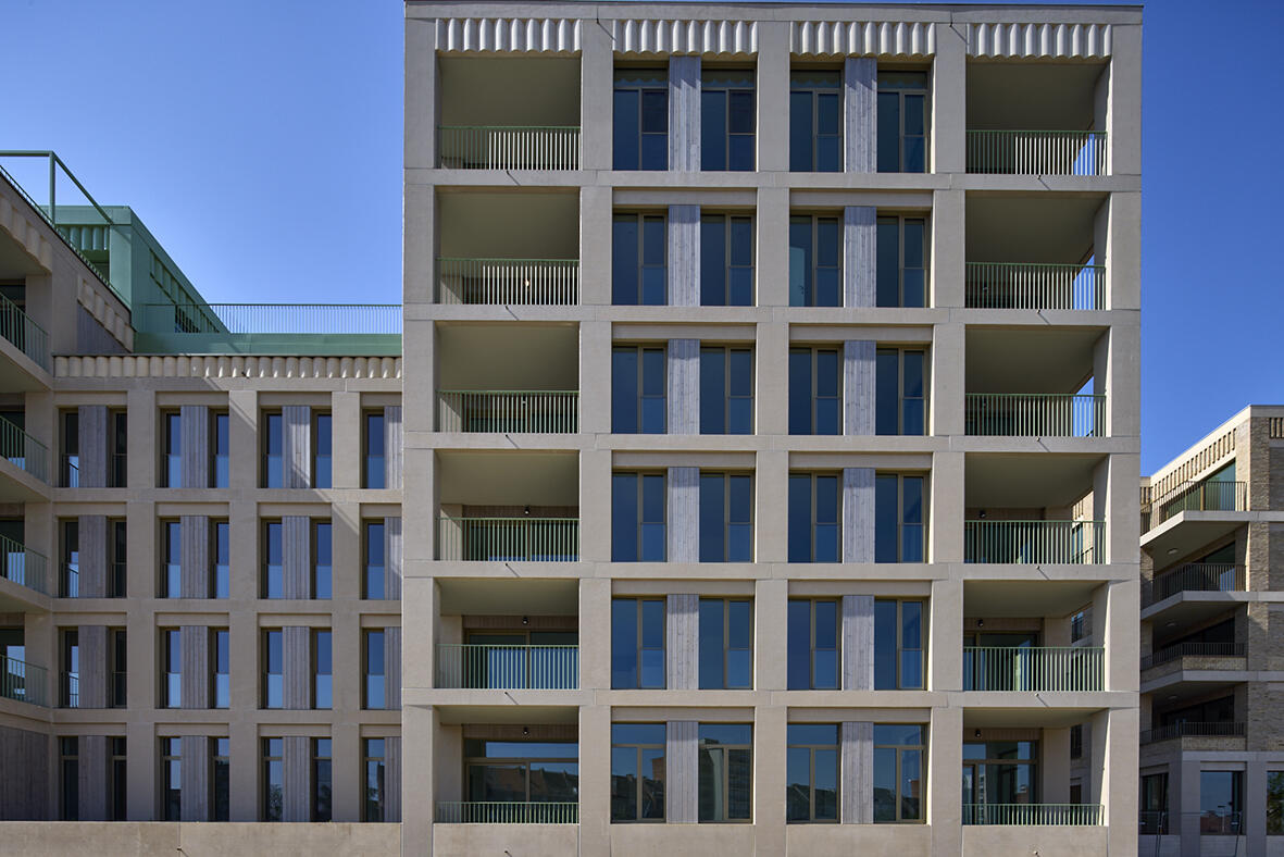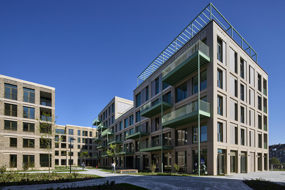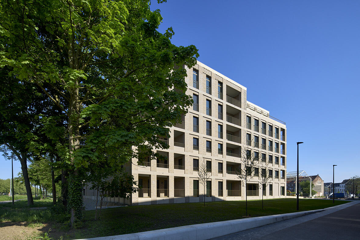 Het eerste gebouw uit deze fase staat aan de rand van het park en vormt een scharnier met het openbaar domein. De plint biedt plaats aan licht verhoogde, grondgebonden woningen die een zachte overgang creëren tussen privé en publiek. De hogere bouwlagen openen zich naar het park met royale buitenruimtes, zichtlijnen en beschutting. Die schakeling zorgt niet alleen voor een genuanceerd gevelbeeld, maar ook voor een duidelijke verankering van het gebouw in zijn context.
