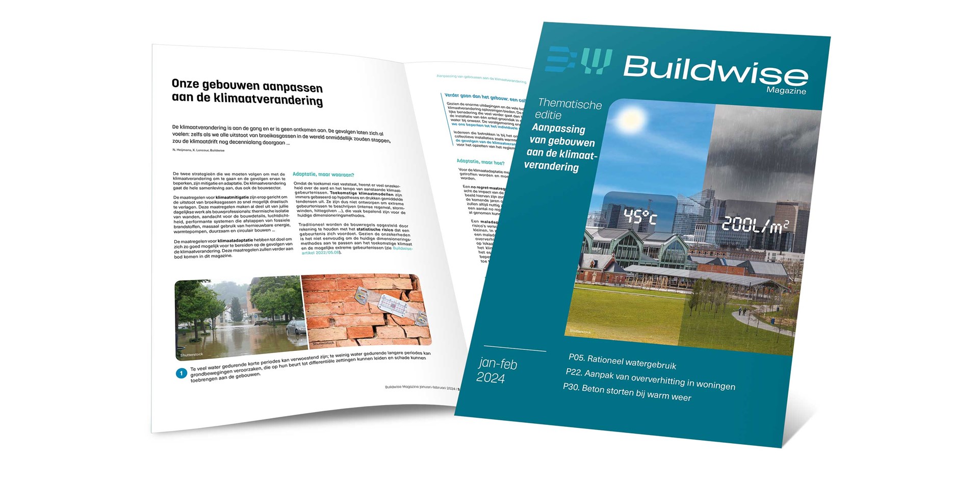 Buildwise wijdde een speciale editie van zijn magazine aan klimaatadaptatie. Daarin besteedt het op een praktijkgerichte manier aandacht aan het omgaan met water, met name aan rationeel watergebruik, hemelwaterputten, overstromingsrobuust verbouwen en grijswater. Andere onderwerpen zijn de impact van klimaatverandering op bouwputten en woningfunderingen, oververhitting en groendaken. Omdat klimaatverandering een impact zal hebben op het dagelijkse werk van de bouwprofessional, gaat het magazine ook in op werken op de werf bij warm weer, op de gevolgen van het veranderende klimaat voor schilders en op beton storten bij warm weer.