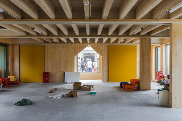 Het interieur van de hoeve is functioneel ingedeeld om diverse activiteiten binnen de jeugdkamer mogelijk te maken. Op de begane grond bevinden zich een vestiaire, een ruime polyvalente zone, een keuken en sanitair, aangevuld met een backstage ruimte voor evenementen. De bovenverdieping is ingericht met ruimtes voor administratie en techniek, evenals een workshopruimte voor creatieve sessies. Dankzij deze indeling kan het gebouw optimaal worden ingezet als de centrale spil voor de jeugdwerking in het district.