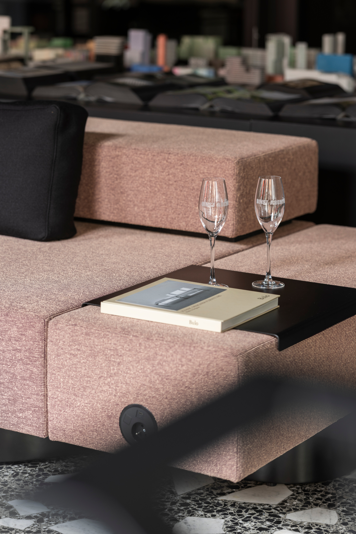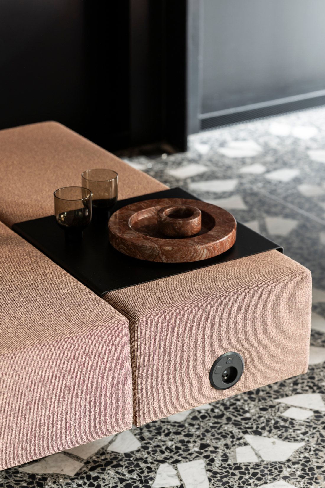 De sofa is voorzien van een stopcontact om je laptop of gsm op te laden en een extra optionele gestoffeerde extensie fungeert enerzijds als opbergelement en anderzijds een dienblad om je glas of laptop veilig te positioneren. De noden van het post-covid tijdperk worden op deze manier verstrengeld in een klassevol object zonder onnodige ornamentiek dat een tijdloze esthetiek uitstraalt en breed inzetbaar is.