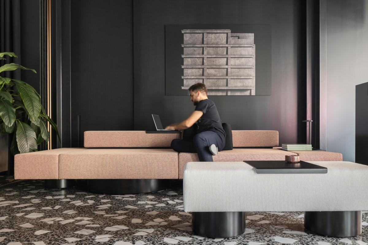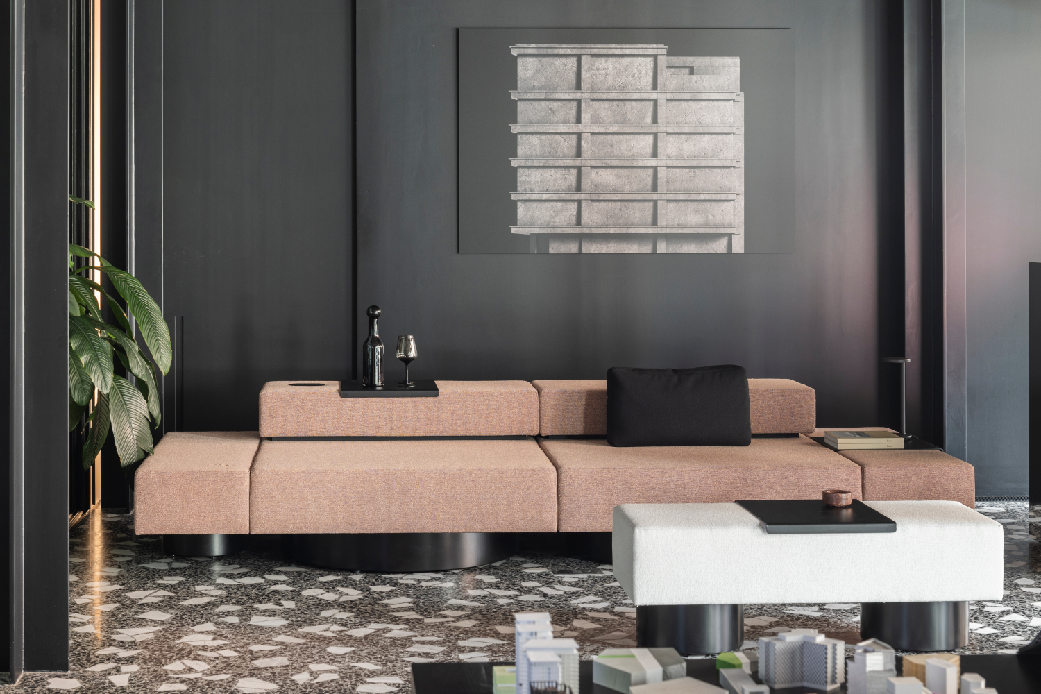"Mensen zijn vandaag voortdurend in beweging en op verplaatsing. Daarom hebben we een modulair element gecreëerd wat zowel in kleine studio’s geïntegreerd kan worden, als in publieke ruimtes zoals een hotellobby of een luchthaven. Op deze manier wordt de sofa een herkenningspunt, een thuis-beleving waar je ook bent."