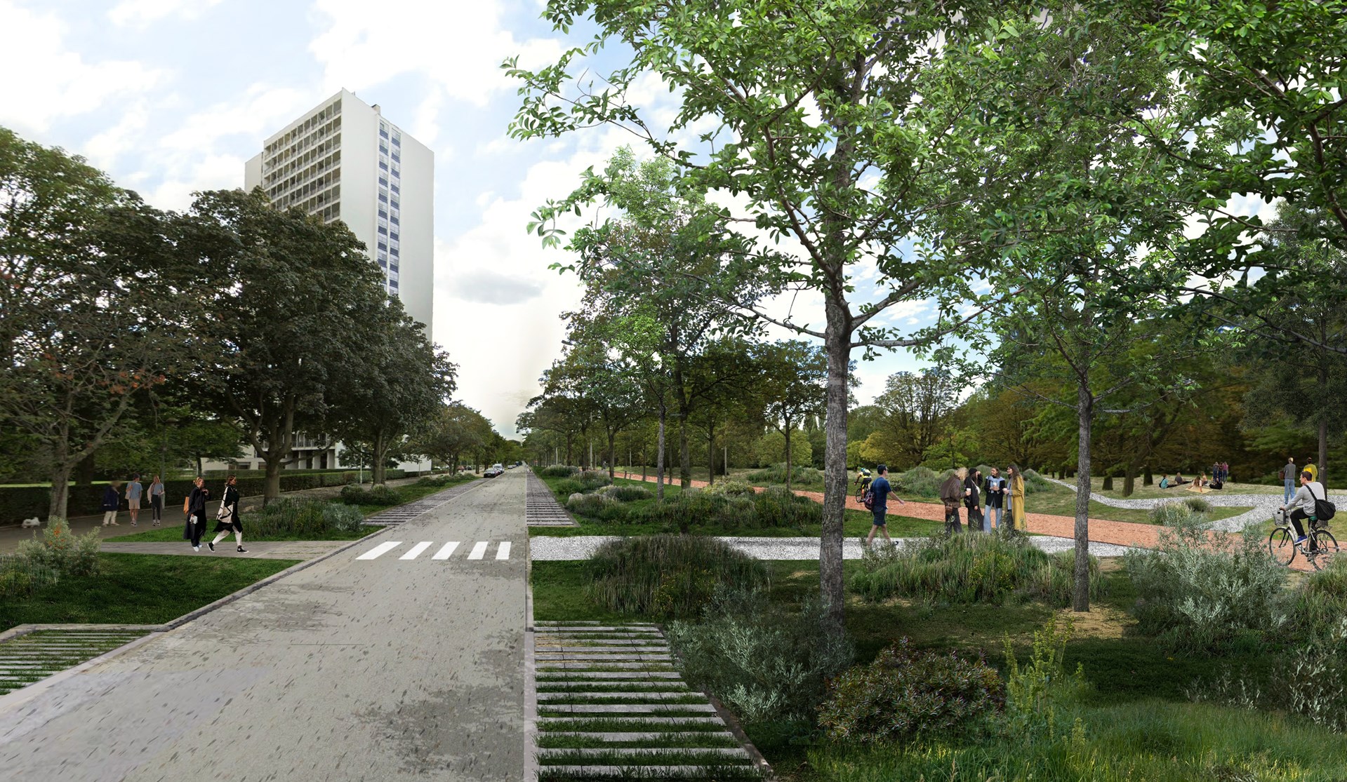 - In het langgerekte park komt een onafgebroken en slingerend padensysteem voor wandelaars en fietsers. Daarnaast komen er lanen voor de functionele verplaatsingen. De ruimte die vrijkomt door het compacte ontwerp van de lanen, wordt onthard en toegevoegd aan de parkruimte. De Kastanjedreef zal dienst doen als as voor laden en lossen, met ook enkele parkeerplaatsen voor mensen met een handicap.