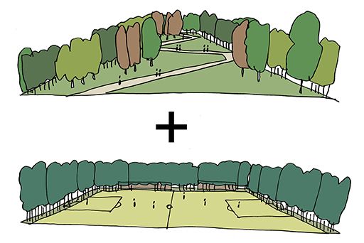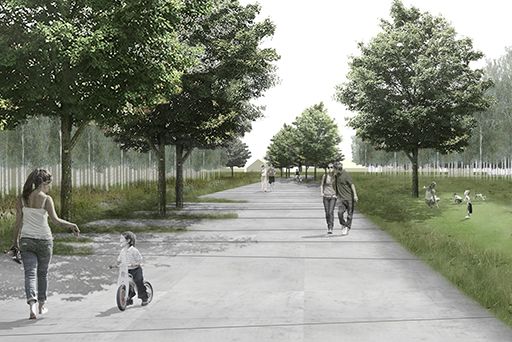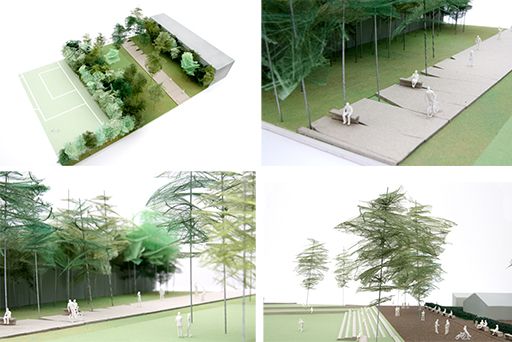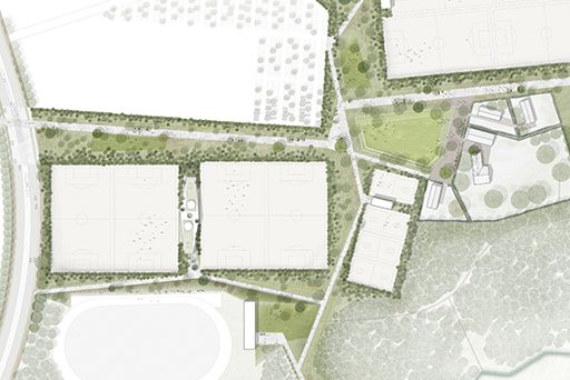 Het beeld van de voegen speelt een grote rol bij de beleving van het park. “We creëerden een hiërarchie waarbij het secundaire padennetwerk zigzag loopt”, zegt architect Jens Aerts. “De sportactiviteiten vormen dan weer de kamers, uitgeholde lege plekken tussen de voegen, omzoomd met een veelheid van stammen met hoge kruinen. De kamers krijgen hierdoor een eigen schaal en architectonische dimensie.”