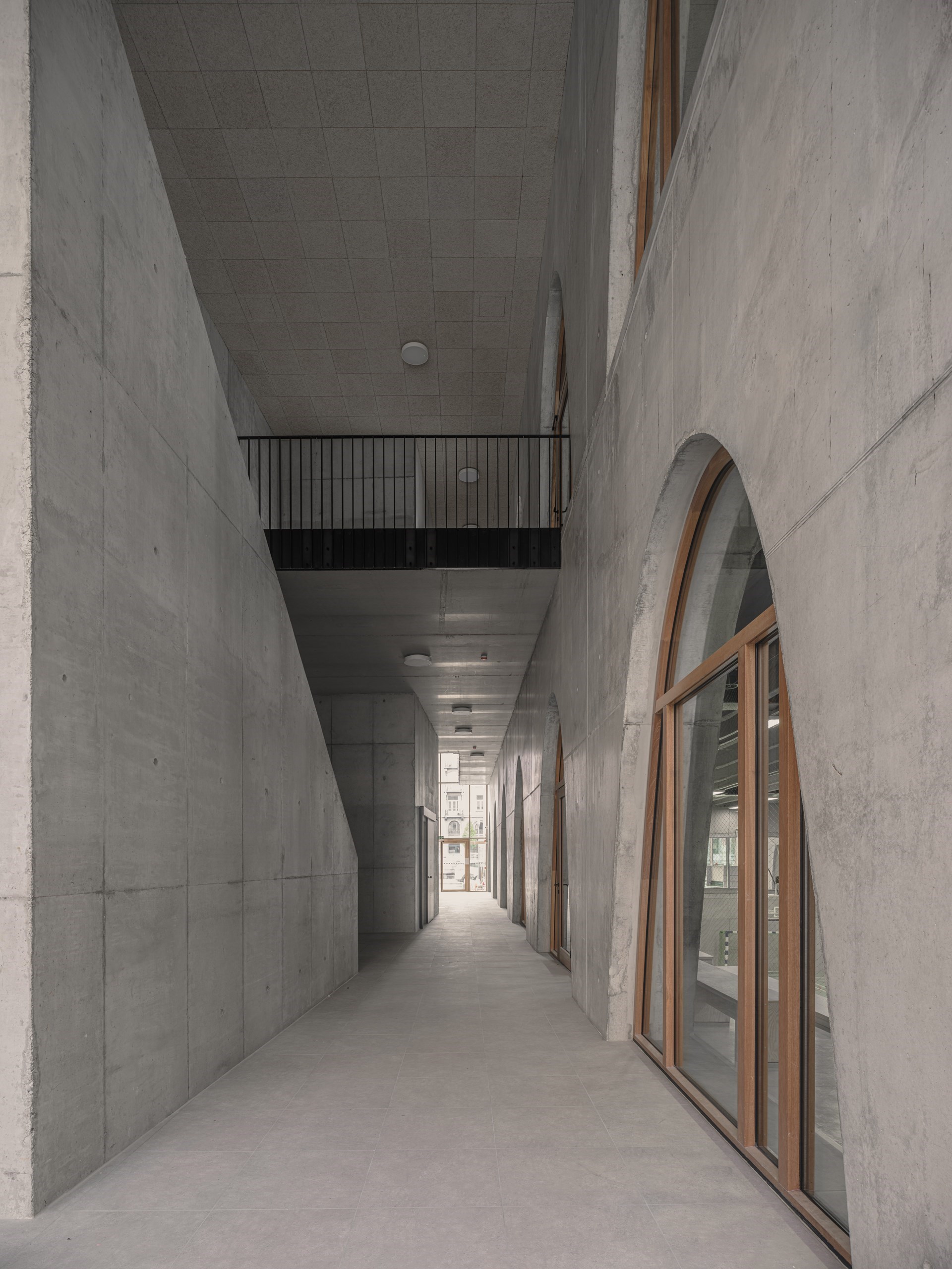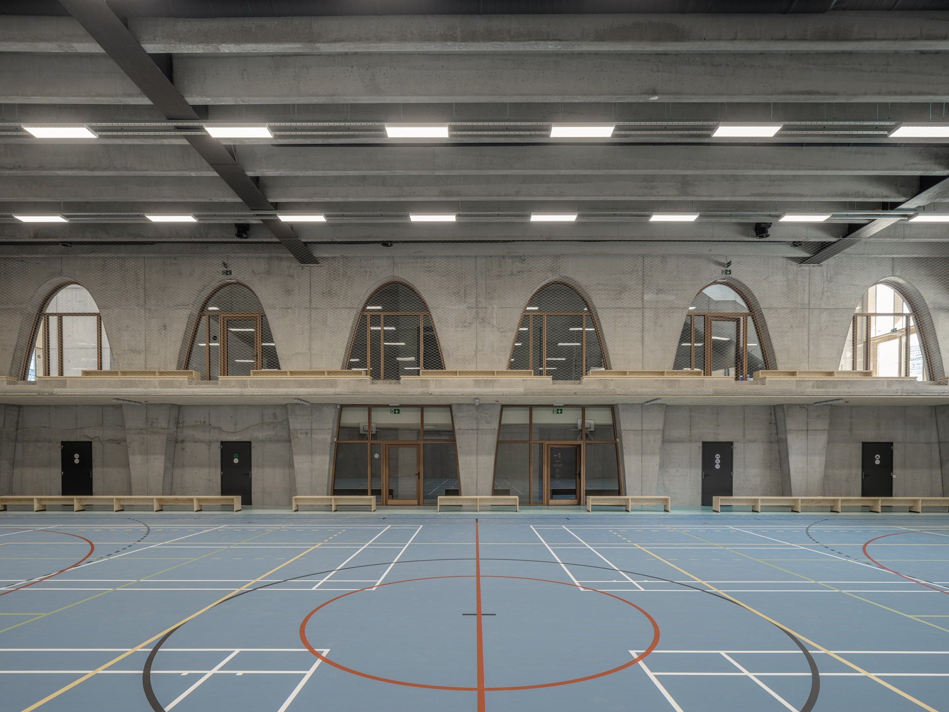 Om de toegang tot de sporthal te vergemakkelijken en de zichtbaarheid ervan vanaf de straat mogelijk te maken, is dit groot volume op de lagere niveaus van het gebouw gesitueerd. De verdiepingen voor de vechtsporten en het kinderdagverblijf komen erbovenop. Deze programmatische keuze, die dwingender is voor de structuur van het gebouw - de logica van het draagvermogen zou eerder aansturen op de plaatsing van dit groot, leeg volume in het bovenste deel van het gebouw - maakt wel een natuurlijke lichtinval in alle ruimtes mogelijk. De wand met de bogen en zijn evenknie op de scheidingsmuur (aan de kant van Ava Papierwaren) draagt vier grote metalen vakwerken van twee verdiepingen hoog waarin het kinderdagverblijf en ook de conciërgewoning zijn ondergebracht.
