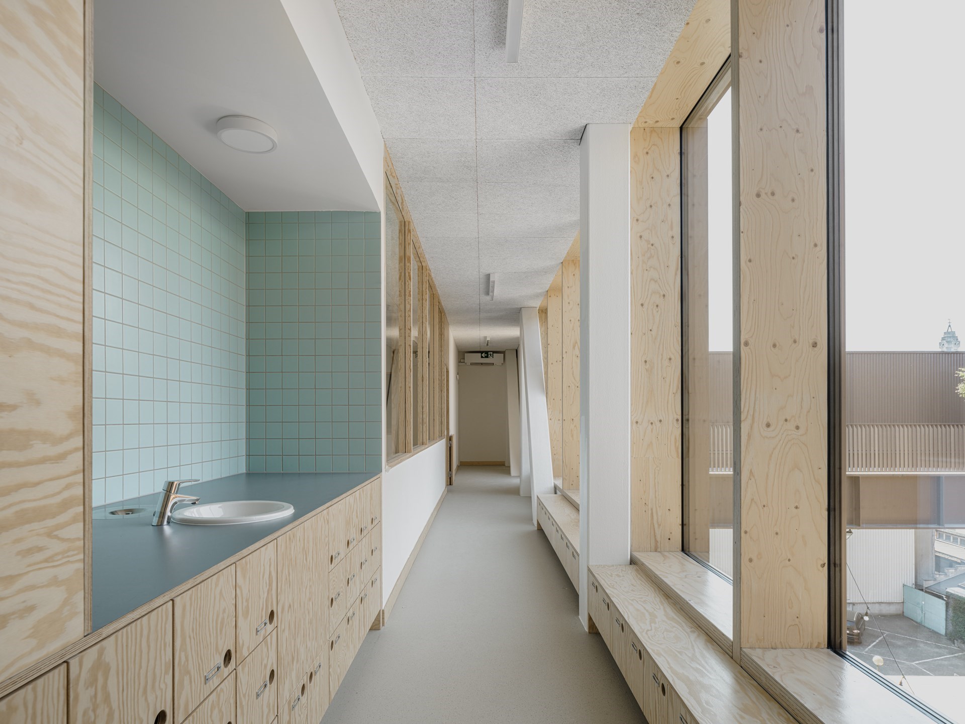 BOGDAN & VAN BROECK heeft een bogengalerij - de Reuzengalerij - ontworpen die het Kanaal met de achterliggende wijk verbindt. Zich uitstrekkend over 3 verdiepingen, brengt een centrale patio - de Patio van de Krachtpatsers - natuurlijk licht in het hart van het project. De patio verbindt de verschillende ruimtes, maakt het ook mogelijk ze uit te breiden en faciliteert de sociale interactie tussen de gebruikers. Dankzij de hangende terrassen - de Tuinen voor de Kleintjes - beschikt het kinderdagverblijf over buitenruimte. Een ingenieuze structuur omhult dit divers programma; een geprefabriceerd en sterk isolerend houten frame bekleedt het geheel.
