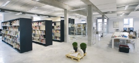 Het schoolgebouw voor de drukkers van morgen kreeg een speelse industriële look in witte en zwarte kleuren.