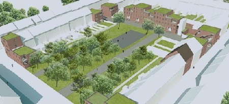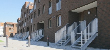 Overzichtsbeeld van de architectuur als invulling in het bestaand woonblok