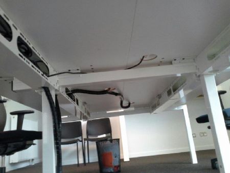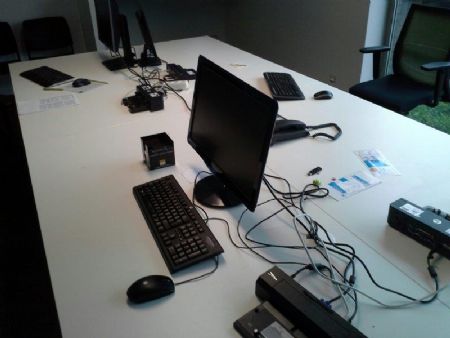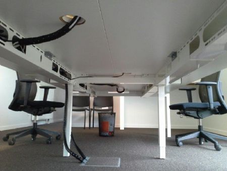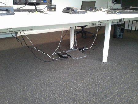 De cable guy komt pas enkele dagen na plaatsing van de bureaus langs bij de klant. Ervoor heeft weinig zin omdat dan nog niet alle telefoons, schermen, computers, printers en andere apparaten op hun definitieve plaats staan.