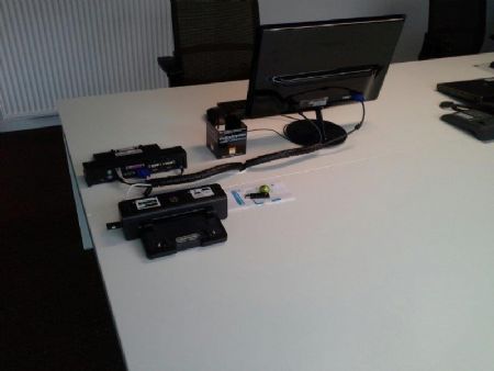 In onze kantoren is cable guy Marc Lambrigts anderhalf uur aan het werk geweest wat ongeveer overeen komt met de gemiddelde duurtijd van zijn ingrepen. Wat heeft hij concreet gedaan om ons te verlossen van die spaghetti van kabels? Hij heeft twee extra openingen gemaakt in de tafels en die afgewerkt met een doorvoerpot. Daardoor zijn er minder kabels zichtbaar op het bureau. Verder heeft hij dominostekkers geplaatst in de kabelgoten onder het bureau waardoor de verdeling van de kabels grotendeels onzichtbaar onder het bureau gebeurt en niet langer in de ingebouwde stopcontacten in de vloer. Tot slot heeft hij alle overgebleven stroom- en netwerkkabels samen in een “slurf” gemonteerd. Daarvoor maakt hij gebruik van een aangepast apparaatje.