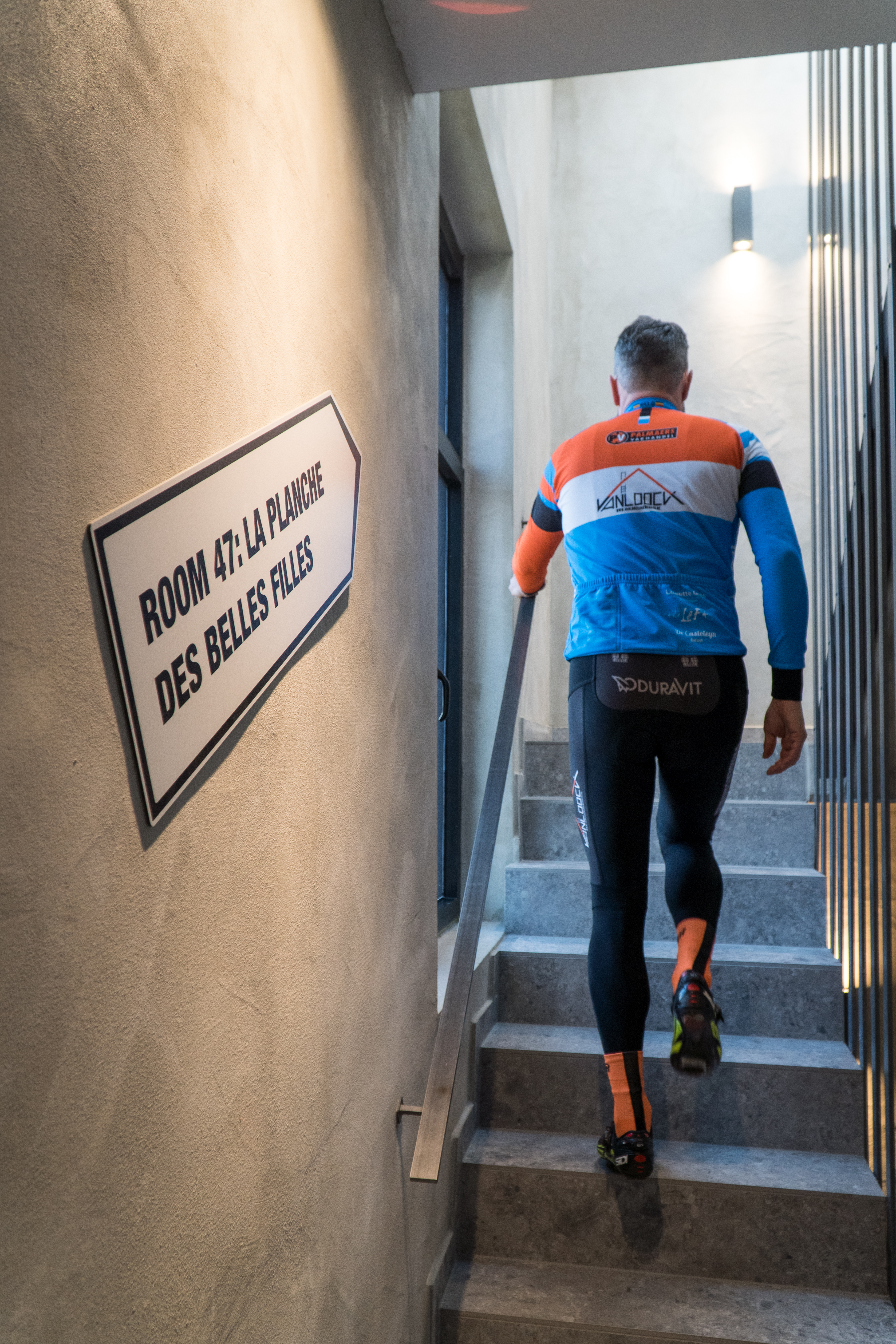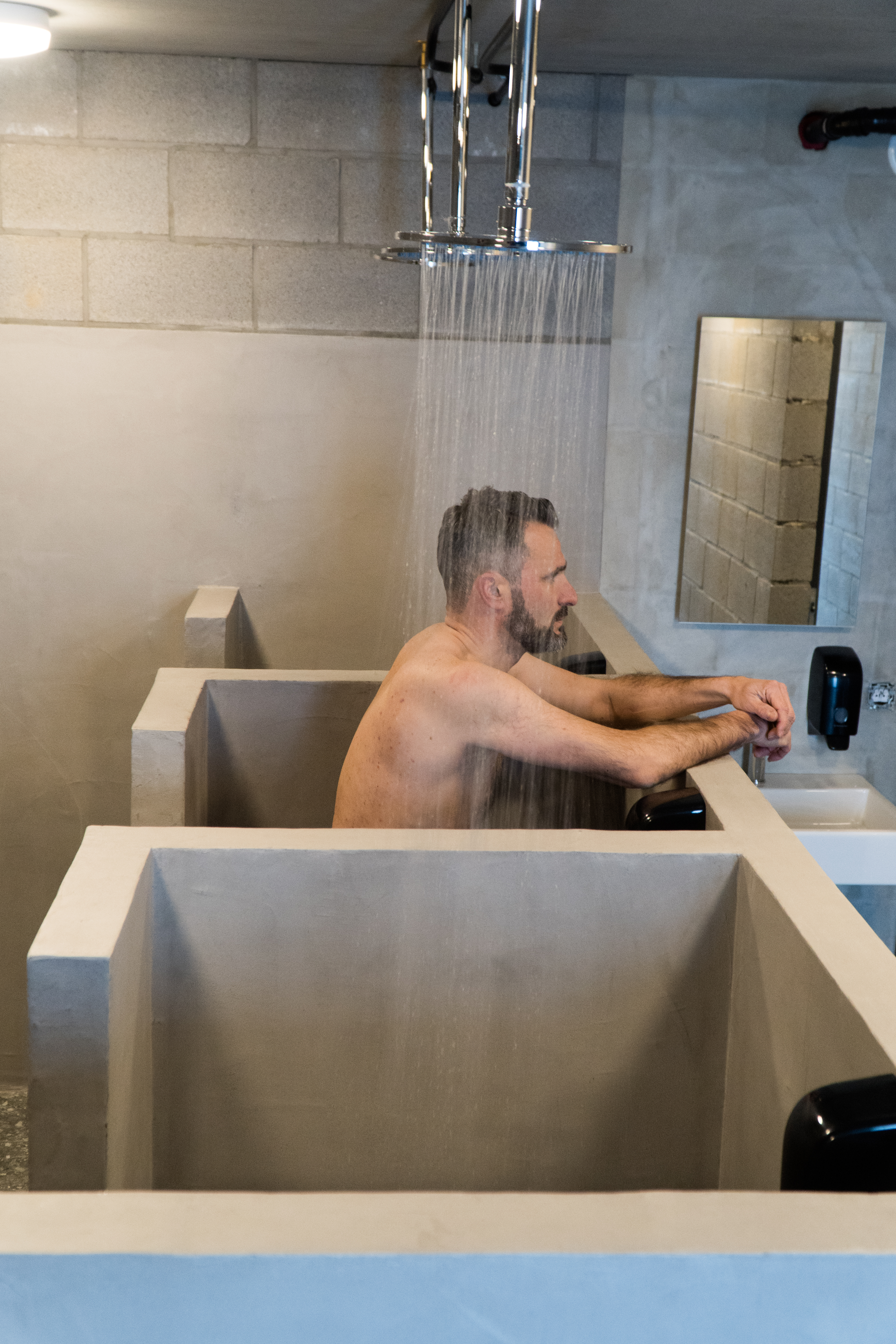 Zowel de Roubaix-douches als de douches in de hotelkamers zorgden echter voor een structurele uitdaging. “De douchebakken moesten zo laag mogelijk in de vloer worden verwerkt, zeker in de kamer voor personen met een handicap. Maar omdat het hotel zich bevindt in het oude schoolgebouw, was het onmogelijk om de vloeren structureel op te hogen. Daarom kozen we voor Tempano-douchebakken, een model dat pas in 2020 gelanceerd werd en voor Café Coureur in primeur werd geleverd. Dit model in acryl is volledig zelfdragend en kan hierdoor zonder poten geplaatst worden met een geringe inbouwdiepte. Zo konden we toch een drempelloos resultaat bekomen”, vertelt Steve Souverijns.