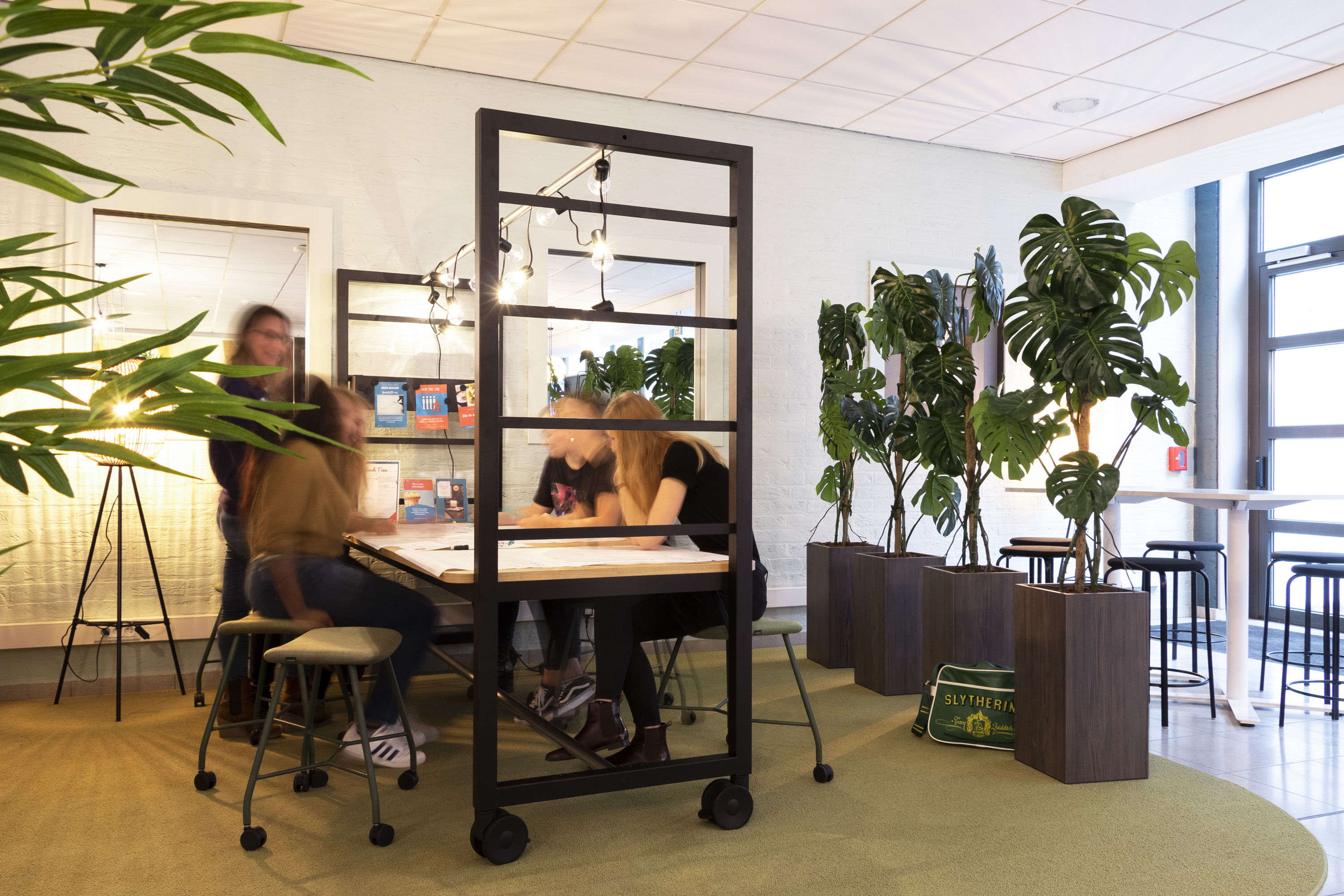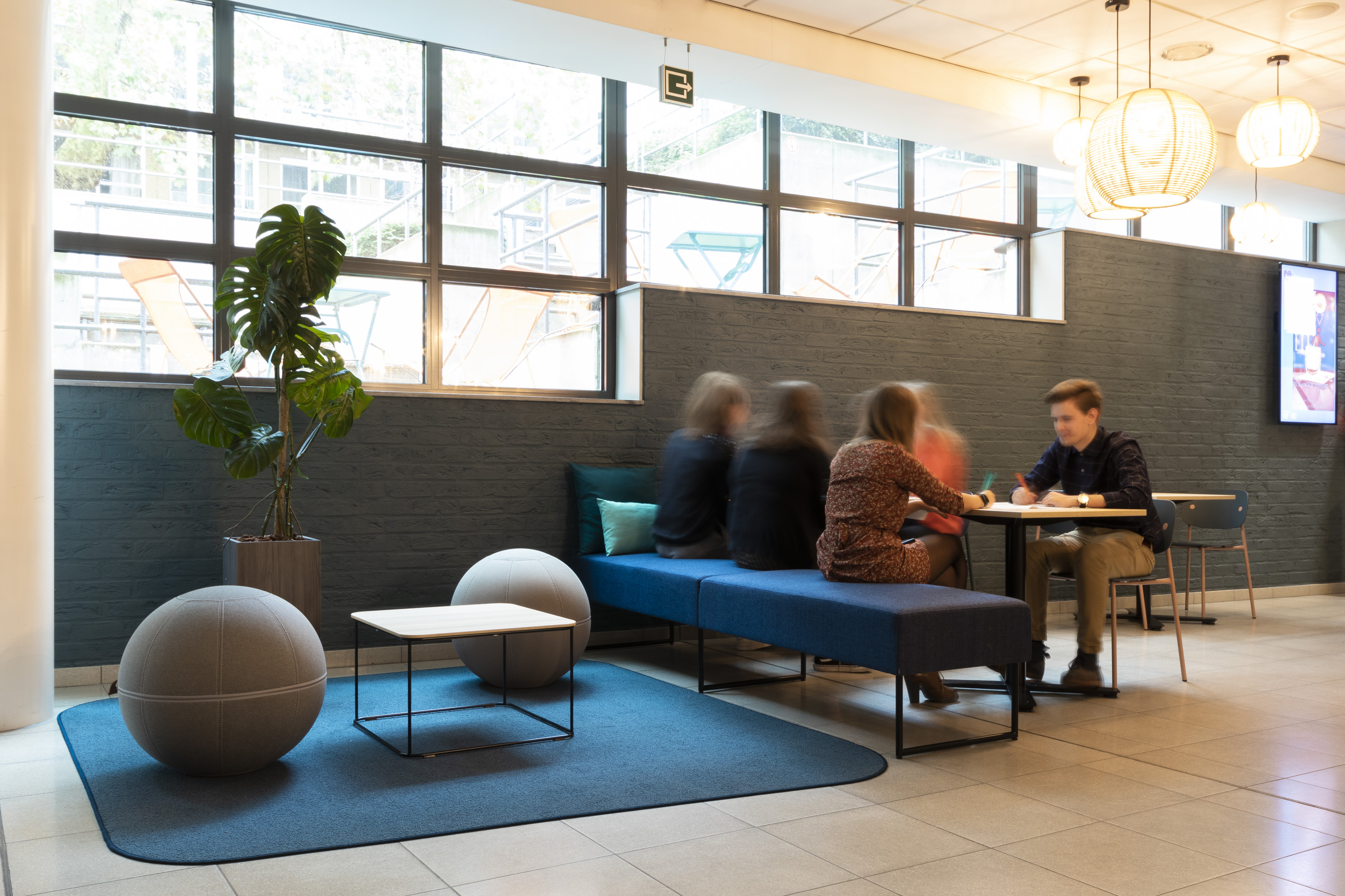 Creatief en veelzijdig meubilair zorgt ervoor dat de studenten nu in grote getale in de cafetaria willen vertoeven. Eyecatchers zijn de Vagabond tafel en de opvallende Anagram stoel van designmerk Materia. Vagabond is de ultieme creatieve tafel. Dankzij het frame kan je de tafel perfect personaliseren: verlichting, beplanting, leuke accessoires ... Je kan het allemaal toevoegen aan de tafel op wielen die ervoor zorgt dat je inspiratiebron nooit opdroogt.