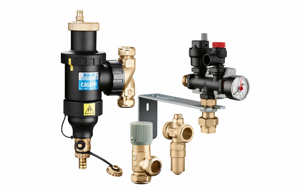 Caleffi levert diverse appendages die een optimale werking van de warmtepomp garanderen. Lucht en vuil veroorzaken vaak problemen in installaties en kan in warmtepompsystemen uiterst destructief zijn. Warmtewisselaars worden alsmaar compacter. Vuil in die installatie vermindert de werking en efficiëntie van de wisselaar, waardoor het energieverbruik hoger wordt. Een vuilafscheider verwijdert alle onzuiverheden en magnetiet uit het installatiewater. Dit is nodig om een optimale werking en hoog rendement van de warmtepomp te kunnen garanderen.