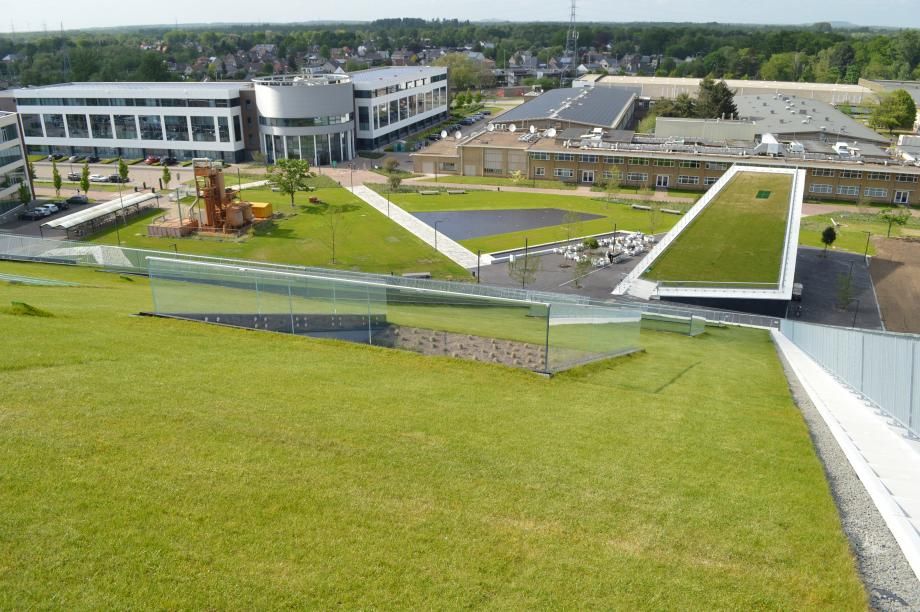 Er werd een specifiek 3D-model ontwikkeld en er werd gebruik gemaakt van speciale EPS drainageplaten die voorzien zijn van watervasthoudende kuipjes zodat er zoveel mogelijk hemelwater in het systeem wordt vastgehouden. Aanvullende bewatering blijft niettemin ook een noodzaak voor het jaarrond groene gazon dat nu eenmaal veel water nodig heeft. Al wordt er hierop wellicht een uitzondering gemaakt tijdens de wintermaanden, waar het hellend dak zelfs al dienst kon doen als snowboardpiste…