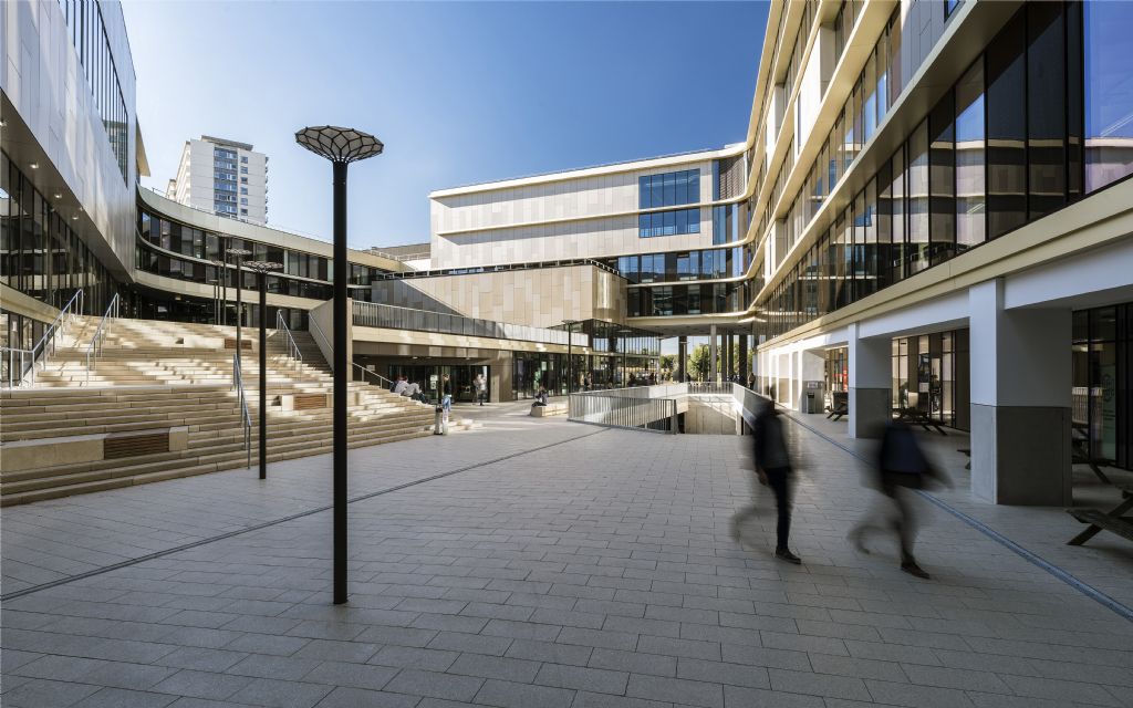 Opvallend is de wijze waarop de gebouwen als een doorwaadbaar geheel zijn opgevat omheen een centraal stedelijk binnenplein, het hart van de Campus. Dit zorgt niet alleen voor contact en daglicht. Deze school wil zich ook bewust profileren als een onderdeel van de stad.