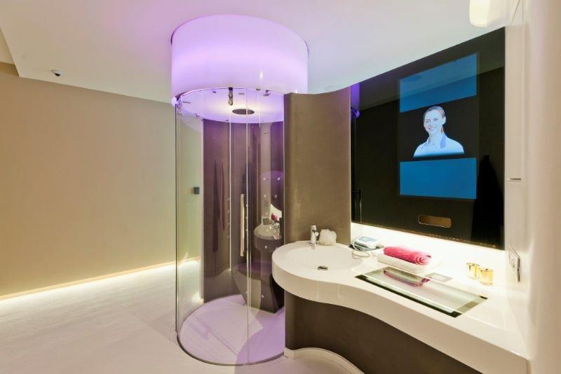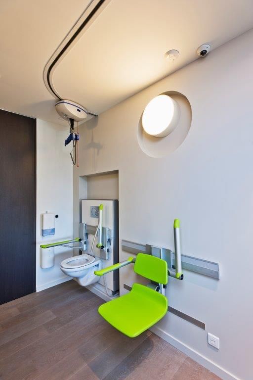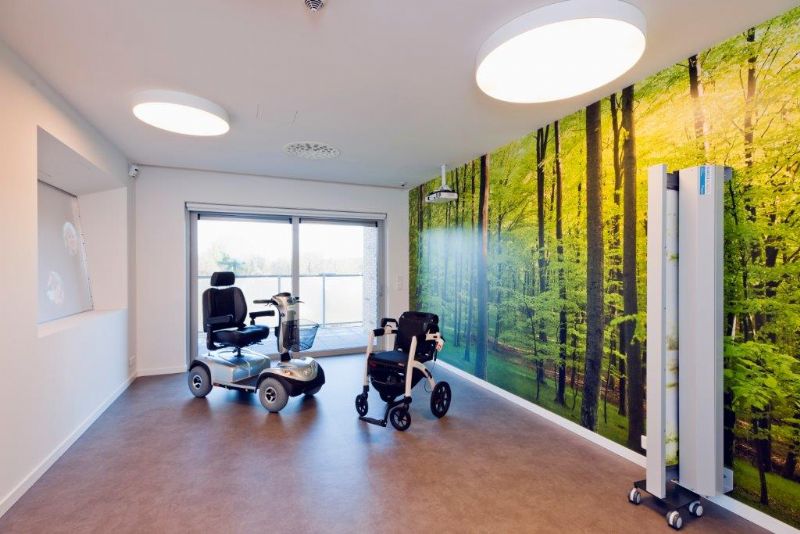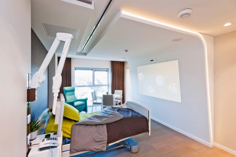 Verderop in Carehome of the Future is een zorgkamer ingericht. Met alle ideeën over huiselijkheid in het achterhoofd, was het weghalen van de medische sfeer ook hier aan de orde. In een zorgkamer lijkt dat in eerste instantie een onmogelijke opdracht, al doet de zorgkamer in Carehome wel degelijk een pak minder kil aan dan vele kamers in bestaande woonzorgcentra vandaag. Enkel het ziekenhuisbed heeft medische connotaties, maar de heldere opbouw van de rest van de kamer maakt het tot een ruimte die meer mogelijkheden biedt dan het opvangen van een patiënt. Er is immers aangenaam veel ruimte voor een uitgebreid familiebezoek en een groot interactief televisietoestel zorgt dat de patiënt snel en makkelijk kan communiceren met de buitenwereld. “Het gaat erom dat een zorgkamer nooit een dood punt in sociale leefwereld van de patiënt wordt,” maakt Bart Thijs duidelijk. “Op een kamer waar je je opgesloten voelt, zal je nooit snel genezen. Een patiënt zal immers veel positiever in het leven staan in een kamer die een waardevolle plek kan zijn in het sociale verkeer van de patiënt en zijn familie en vrienden.”