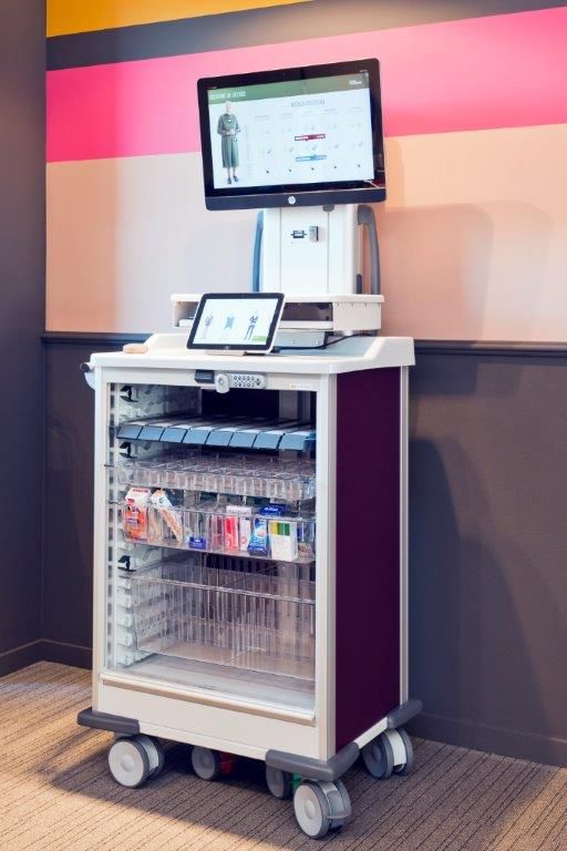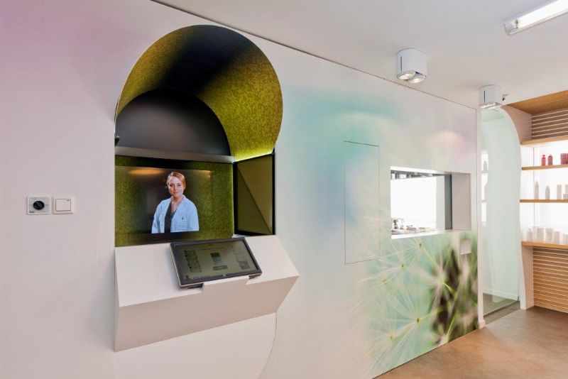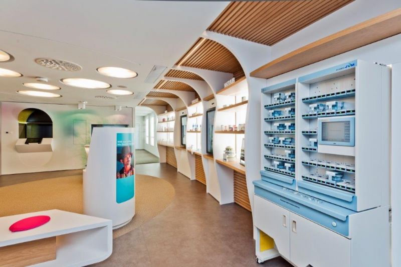 Via de lift en gepersonaliseerde deuren – ze gaan enkel open na het inscannen van een vingerafdruk van bewoner of personeel – bereikt de bezoeker vervolgens de apotheek van de toekomst. Die herziet de heersende ideeën over wat een apotheek op medisch en sociaal vlak vandaag betekent totaal. Living Tomorrow ging tijdens de voorbereidingen met zijn partners dan ook op zoek naar een oplossing voor twee grote issues. Bart Thijs legt uit: “Ten eerste willen we dat apothekers weer volledig hun job kunnen uitvoeren. Te vaak staan ze immers slechts als verkopers achter hun toonbank. Bovendien willen we in de apotheek van de toekomst zorgen dat mensen in alle beslotenheid en vertrouwen om medicatie kunnen gaan. Beide willen we combineren in een plaats die tegelijk een sociale ontmoetingsplek is tussen iedereen die de apotheek bezoekt en toch een plek is waar je in het volste vertrouwen met iemand over je medisch dossier kan praten.”
