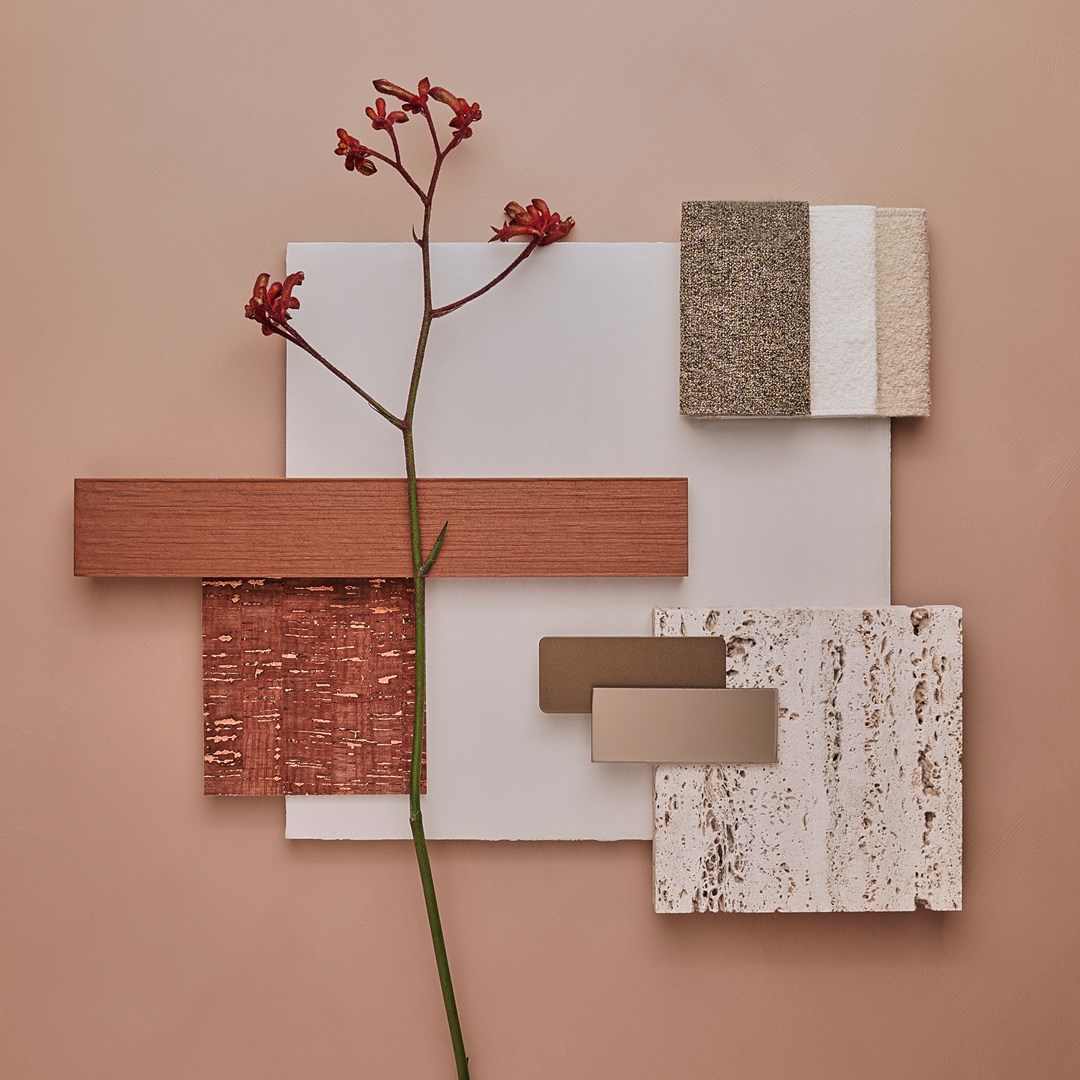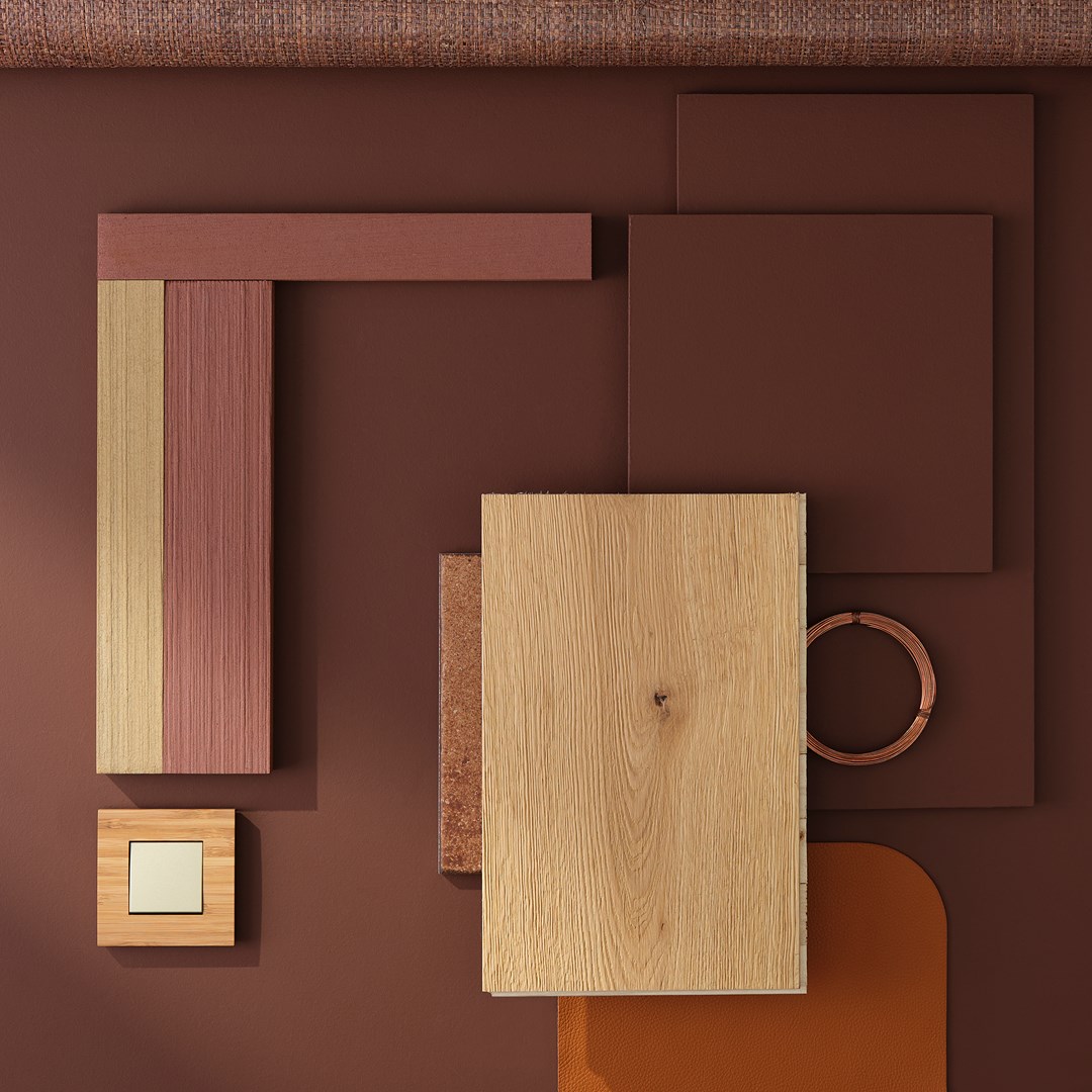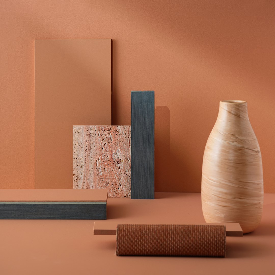 Terra, een moderne aardetint geïnspireerd door terracotta en kleikleuren, creëert een warme en uitnodigende sfeer in interieurs. Deze rijke, natuurlijke tint voegt een gevoel van rust en gezelligheid toe, versterkt door de organische textuur van het hout.