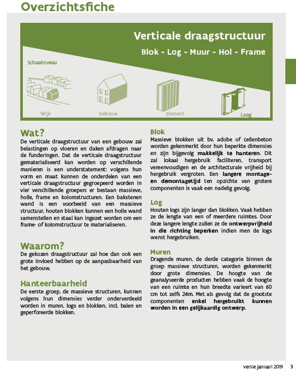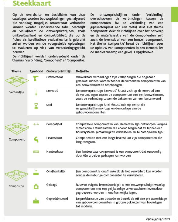 De catalogus ‘Veranderingsgericht bouwen’ is drieledig opgebouwd. De steekkaart functioneert als algemene handleiding en visualiseert de ontwerprichtlijnen. Voor elke functionele laag binnen het gebouw is er daarnaast ook een overzichtsfiche, die de mogelijke materialisatie van die bewuste laag weergeeft en de invloed van het geselecteerde materiaal op de aanpasbaarheid van het gebouw. De basisfiche ten slotte, beschrijft en visualiseert de oplossingen voor een concrete groep materialen.