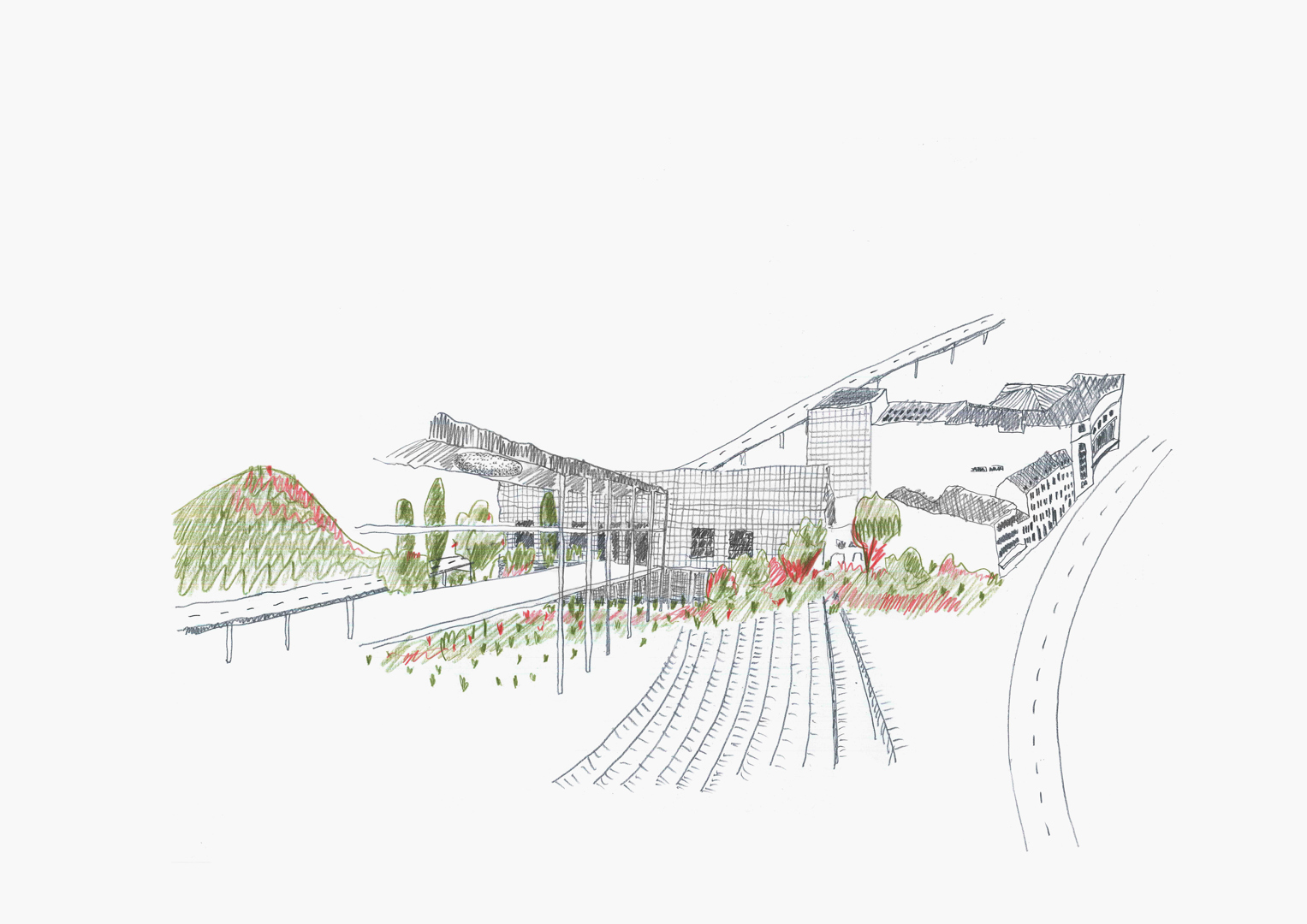 Ook de relatie met het landschap werd fundamenteel herdacht. Verharde zones maakten plaats voor een doorlopend groen park, terwijl de slakkenberg waarop het gebouw staat opnieuw werd blootgelegd en ingezaaid met inheemse vegetatie. De zuidvleugel kreeg een nieuwe functie als meerlagige parking, deels natuurlijk geventileerd, terwijl selectieve sloop elders onverwachte kwaliteiten opleverde, zoals parkruimte waar vroeger parkeerplaatsen lagen.
