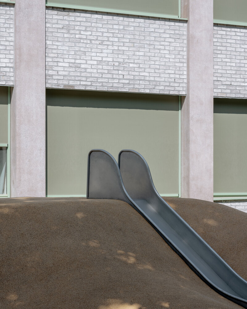 Parallel met de gebouwrenovatie hertekende MULTIPLE ook de speelplaats, die voorheen bestond uit een verharde, monotone vlakte. Vandaag is ze een groen, doorlaatbaar en veelzijdig landschap waar water, bodem en beplanting zichtbaar en beleefbaar zijn. Regenwater wordt opgevangen via open goten en wadi’s, waardoor kinderen letterlijk leren hoe het watersysteem werkt.