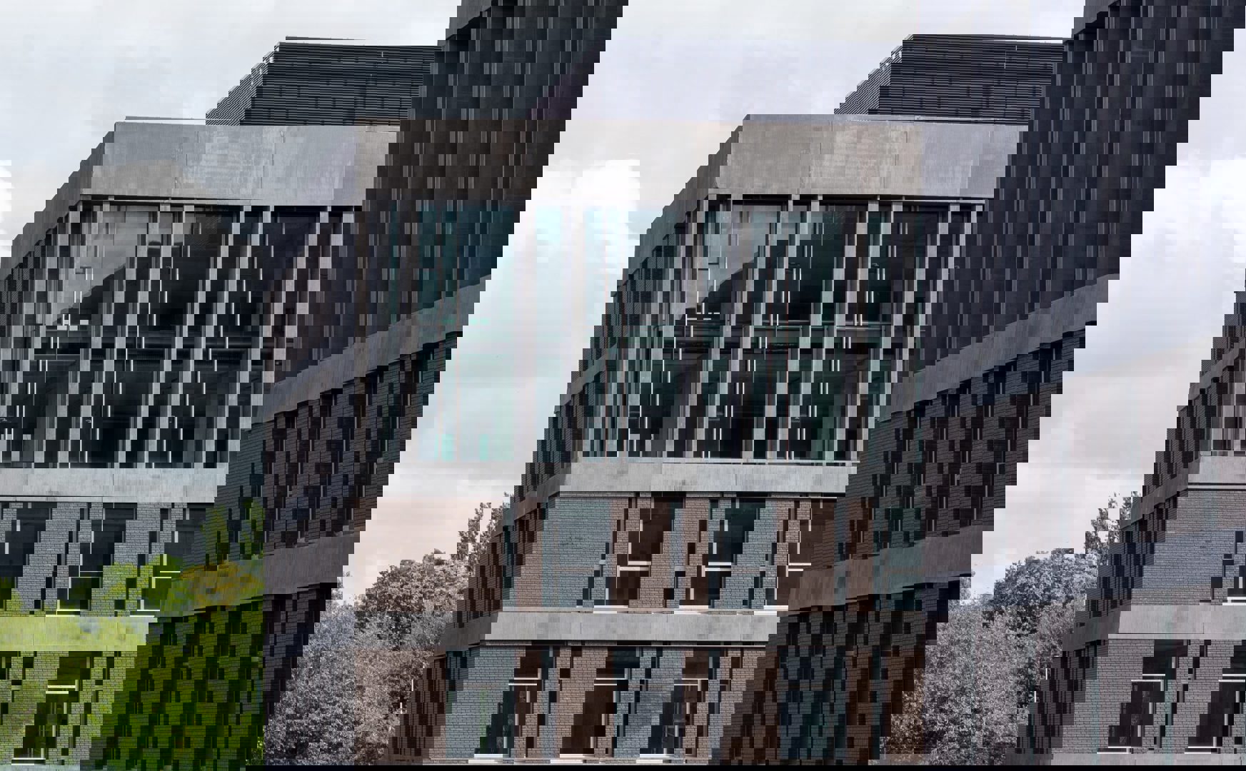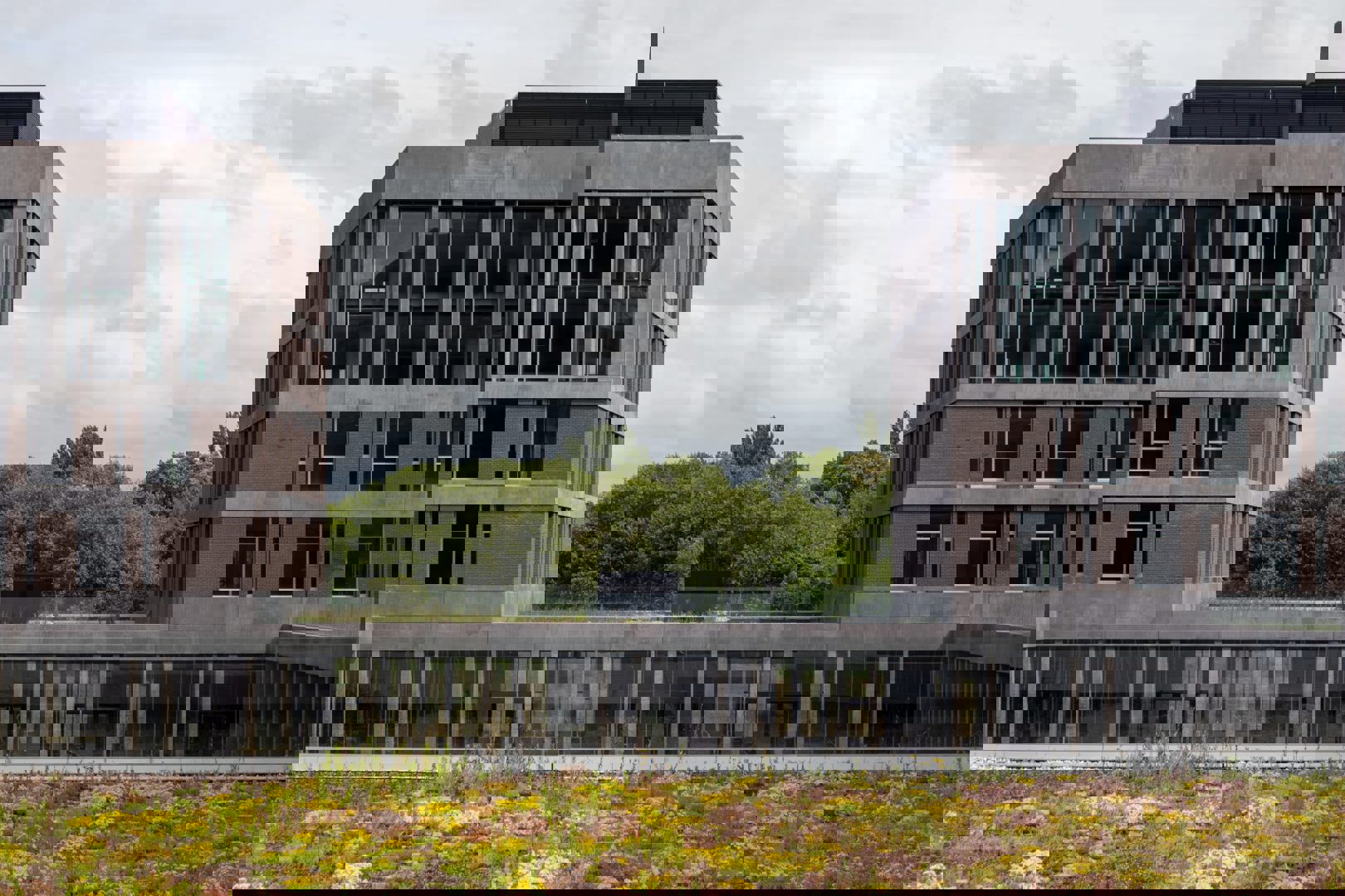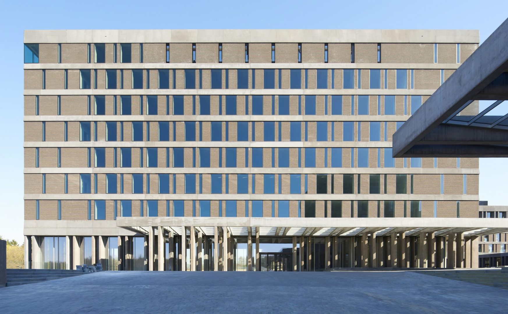 De architectuur speelt met het contrast tussen robuust en verfijnd. De sokkel bestaat uit bakstenen muren en stroken architectonisch beton, waarin verticale uitsparingen zorgen voor diepe slagschaduwen. Daarboven zweven lichtere kantoorgevels in glas met subtiele kleurgradaties en zonneweringen in roestvrij staal. Zo ontstaat een visueel ritmisch en technisch genuanceerd geheel, dat tegelijk rust uitstraalt en uitnodigt tot interactie.