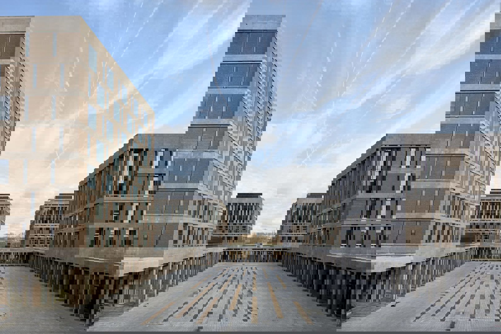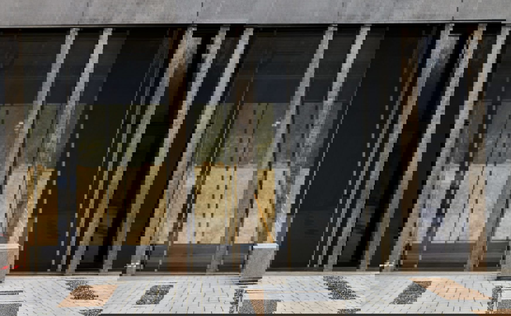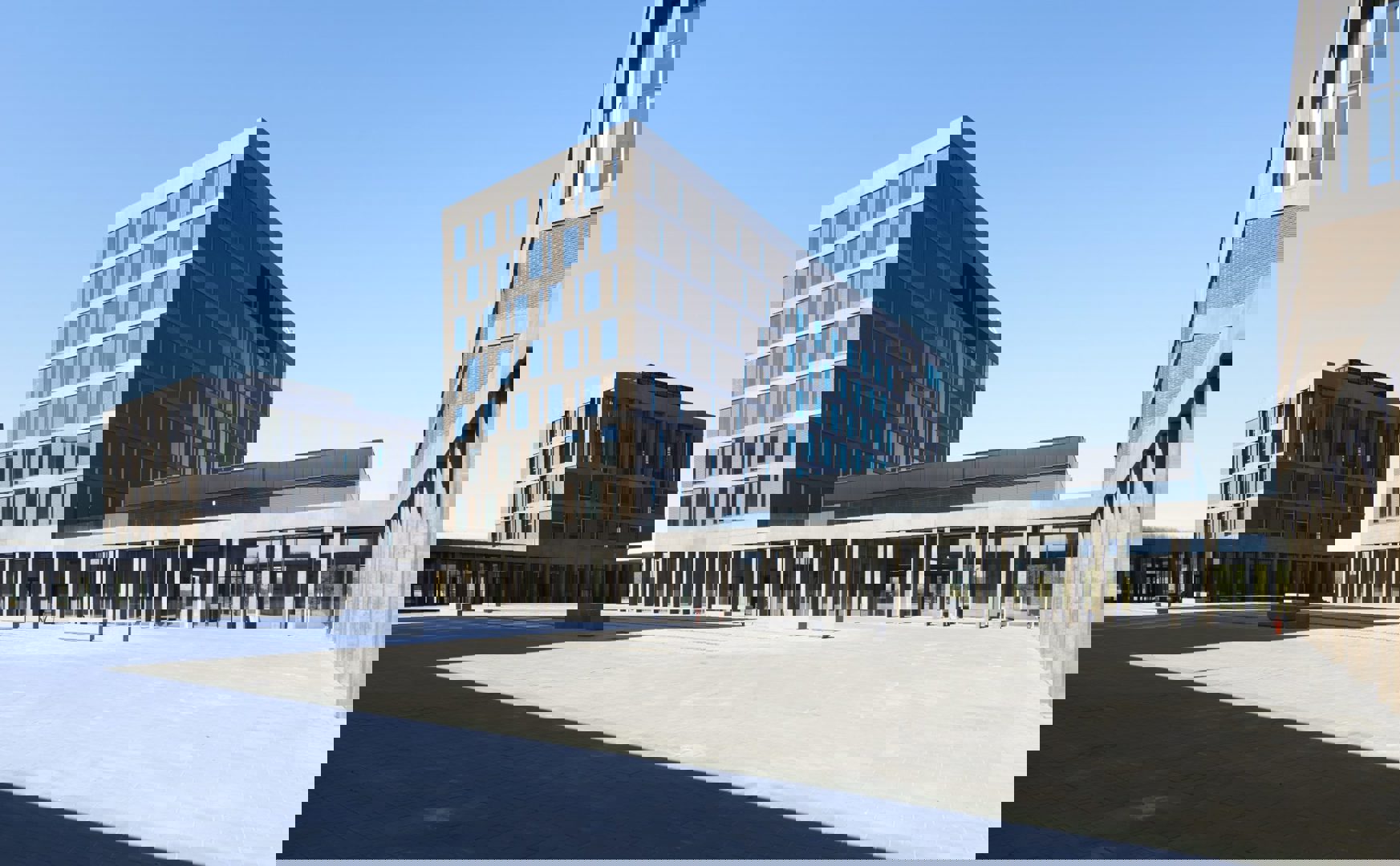 De architectuur speelt met het contrast tussen robuust en verfijnd. De sokkel bestaat uit bakstenen muren en stroken architectonisch beton, waarin verticale uitsparingen zorgen voor diepe slagschaduwen. Daarboven zweven lichtere kantoorgevels in glas met subtiele kleurgradaties en zonneweringen in roestvrij staal. Zo ontstaat een visueel ritmisch en technisch genuanceerd geheel, dat tegelijk rust uitstraalt en uitnodigt tot interactie.