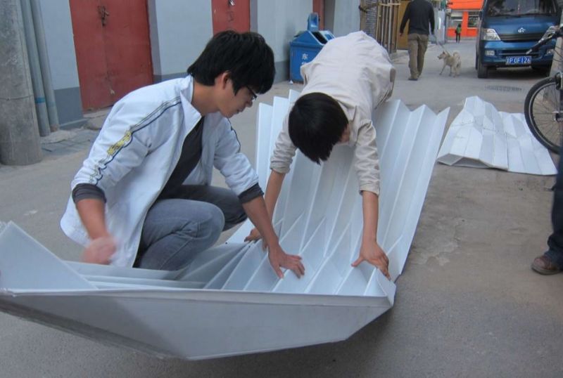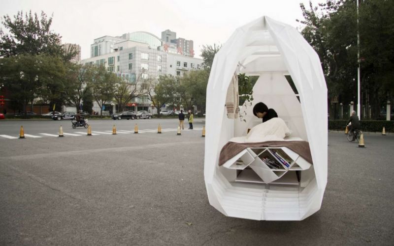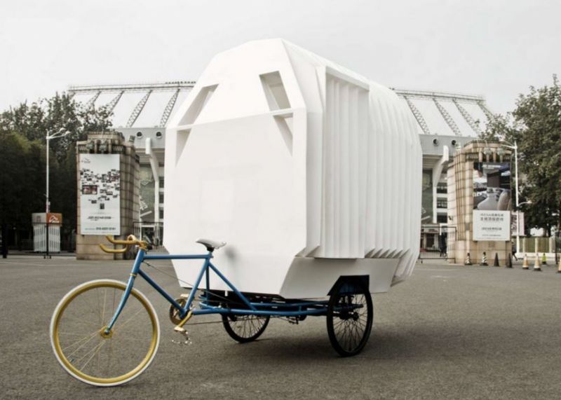 China kent geen privébezit. Daarom vonden architect James Shen en Zang Feng er niets beters op dan een fiets om te bouwen tot huis. En zo geschiedde, het huis van de toekomst is een plastic accordion.