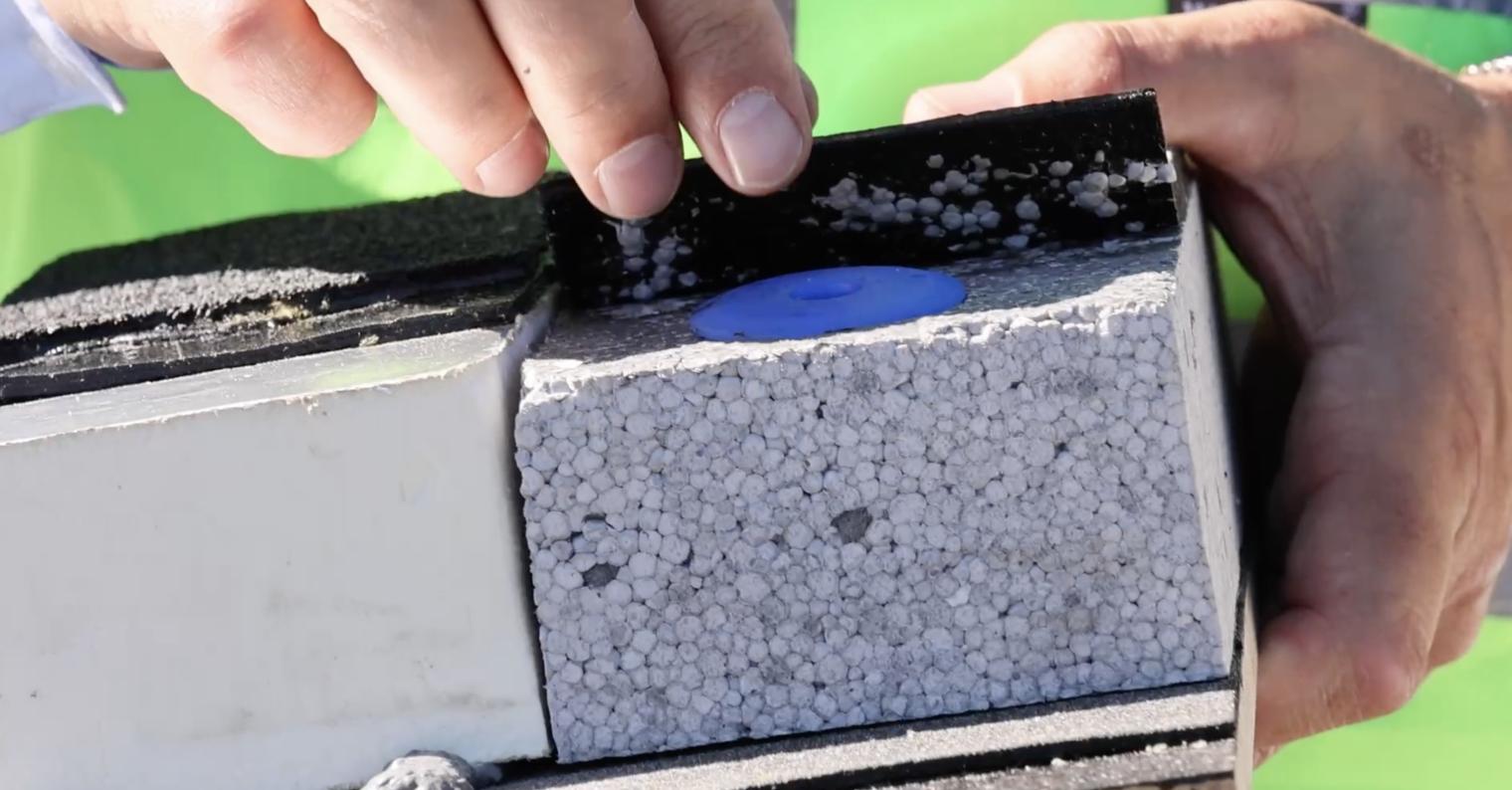Een essentieel element in het duurzaamheidsproces is de dakopbouw. Door de volledig mechanische bevestiging van de dubbele isolatielaag is hergebruik gemakkelijk haalbaar. De standaard druklaag is vlakgeplaatst met daarop een dampscherm en bovenop de dubbellaagse EPS afschotisolatie, die met pluggen is bevestigd. Meestal wordt die gekleefd maar in dit geval niet. Zo blijft hergebruik later en circulariteit troef.