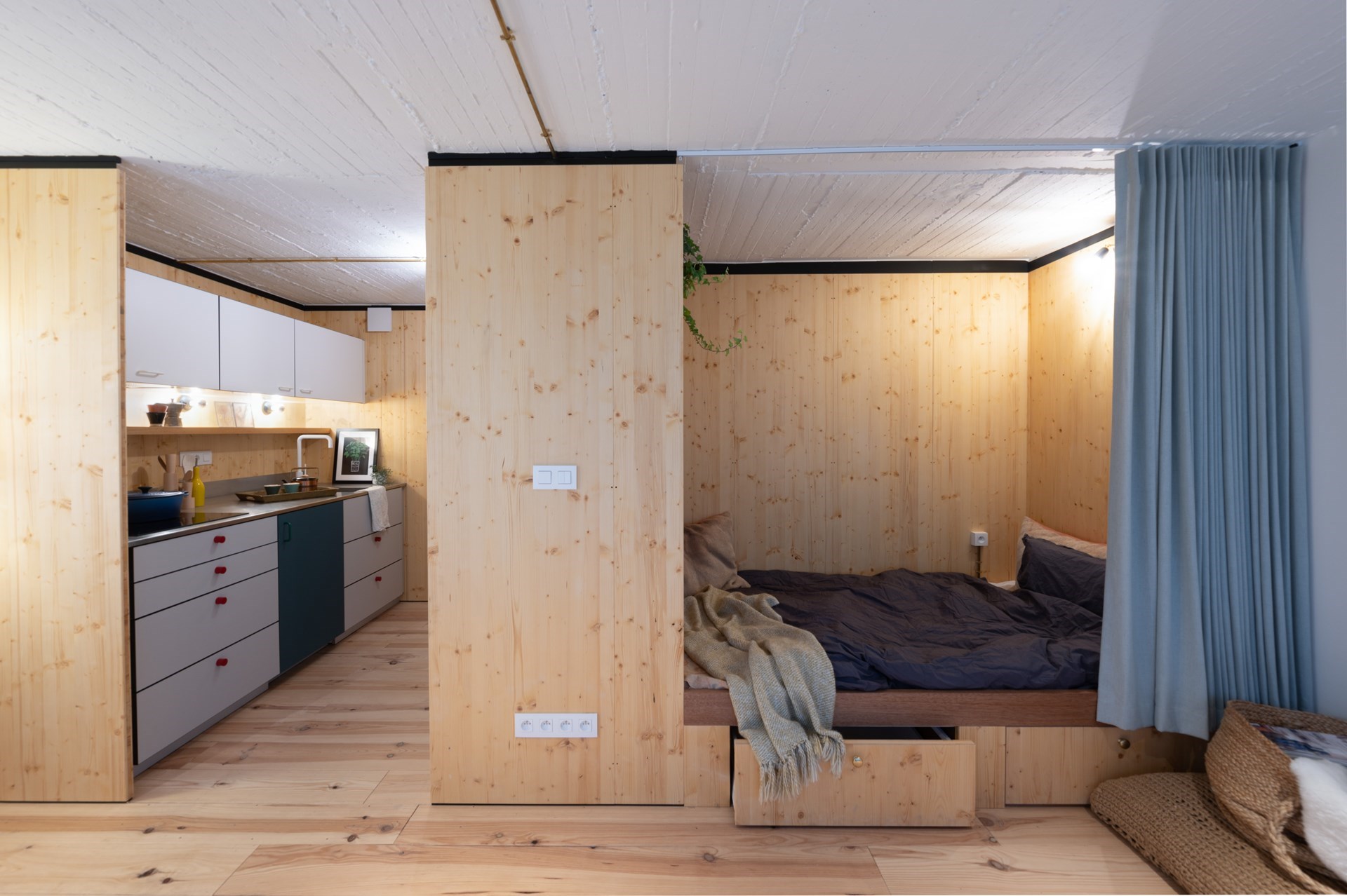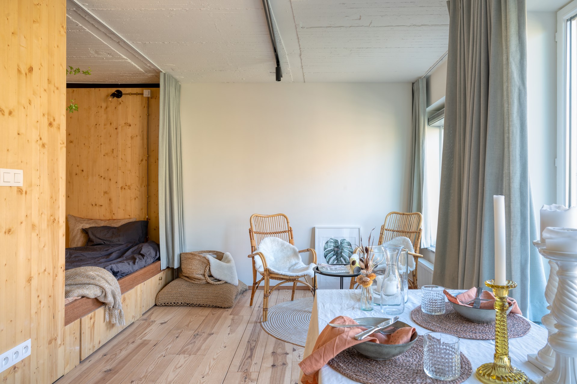 Daarnaast zocht KPW architecten naar een slimme en compacte oplossing om toch op een kleine oppervlakte het gemak van een ruim appartement aan te bieden. Dit doet ze door een inkom en badkamer slim te combineren of een slaapnis te ontwikkelen met maximale bergruimte. Het architectenbureau ontmantelde en renoveerde de drie studio’s volgens de principes van circulair bouwen. Voor de aanneming deed het team beroep op sociale initiatieven.