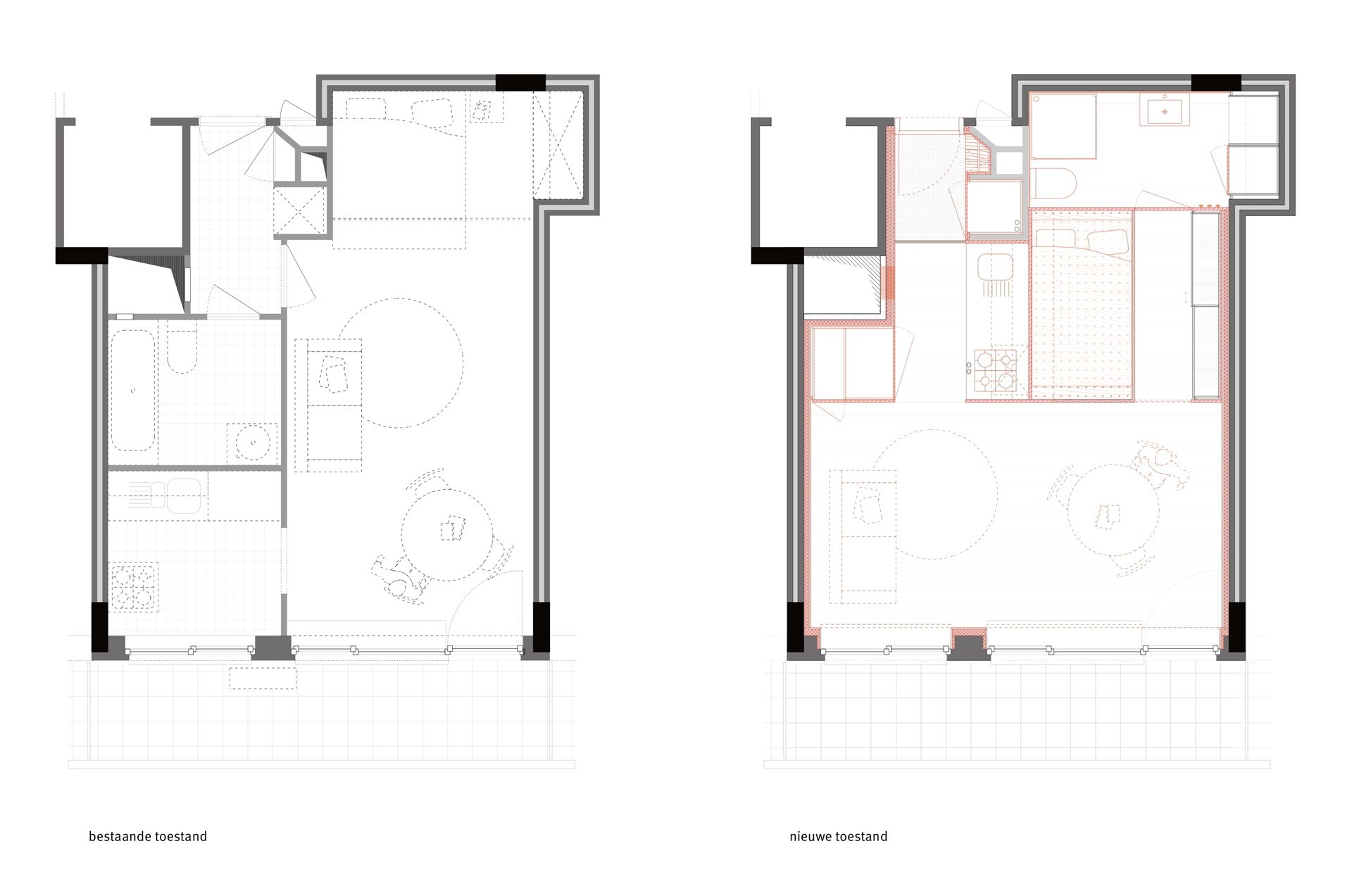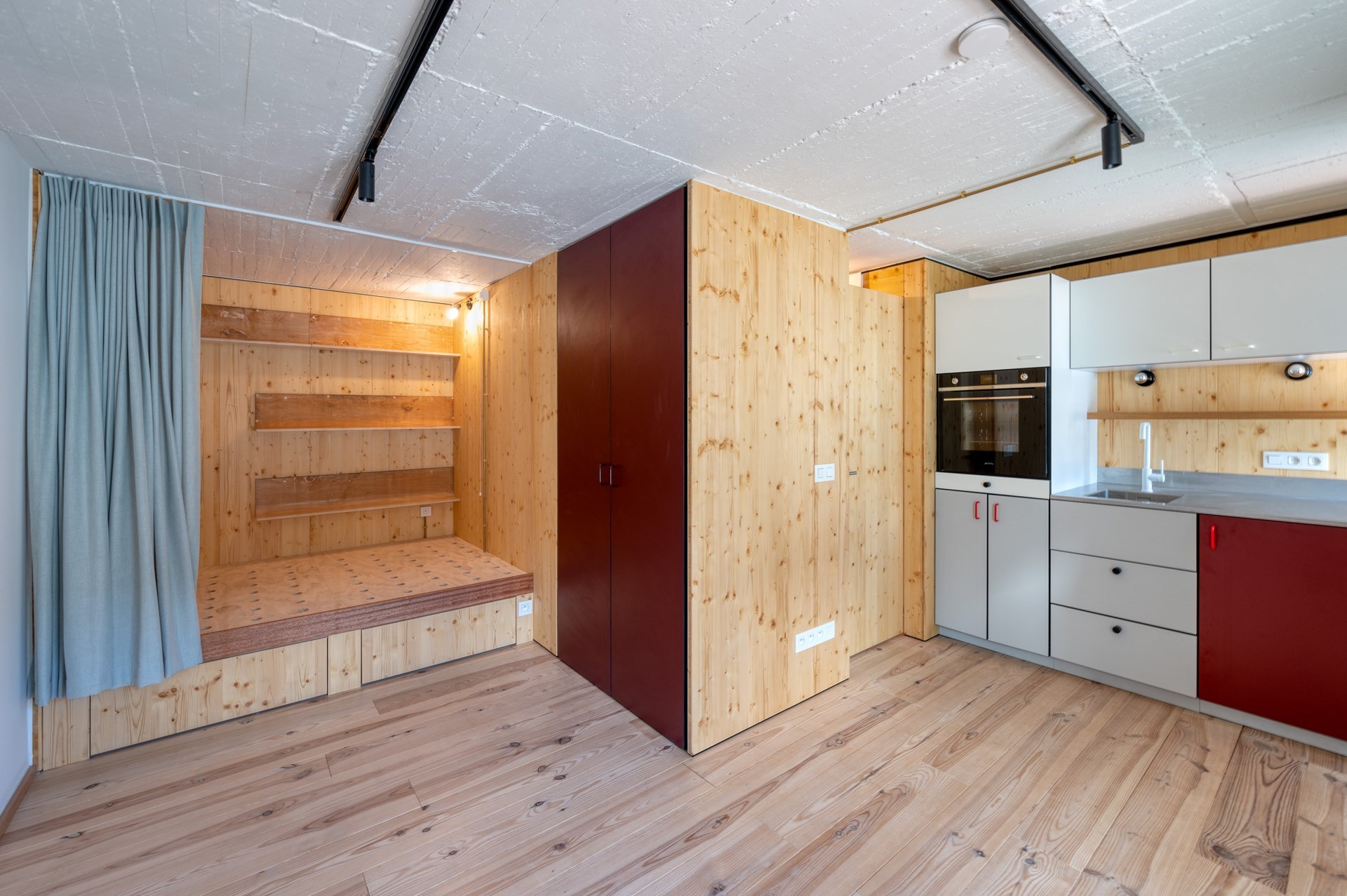 Bij de renovatie in een woongebouw in het centrum van Leuven werd er geen bijkomende open ruimte ingenomen. De intelligentie van dit project ligt in het omvormen van een kleinere ruimte, ongeveer 30 tot 34 m2, tot een aantrekkelijk en comfortabel micro-appartement. Op een beperkte oppervlakte wordt er een hoge woonkwaliteit aan een zeer betaalbare huurprijs aangeboden, de hoofddoelstelling van AG Stadsontwikkeling Leuven.
