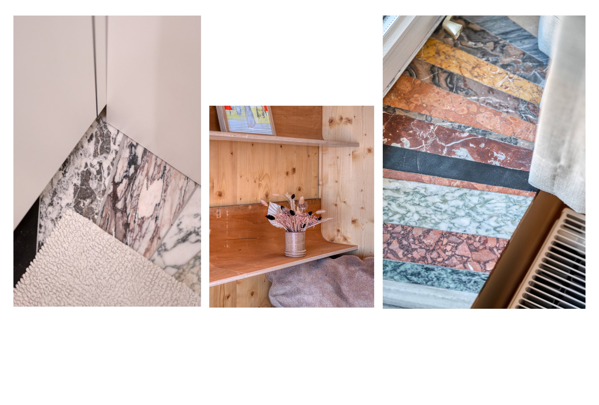 Als aanvulling voor deze materialen gebruikte de aannemer recuperatiematerialen en productieoverschotten. Zo zijn de inox-werkbladen van de keukens afkomstig uit het Leuvense politiehuis. De oude schoorsteenmantels werden verwerkt tot unieke natuurstenen die je nu kan terugvinden als mozaïekvloeren in de inkom. Indien er toch nieuwe materialen werden toegepast, koos de architect voor duurzame alternatieven.