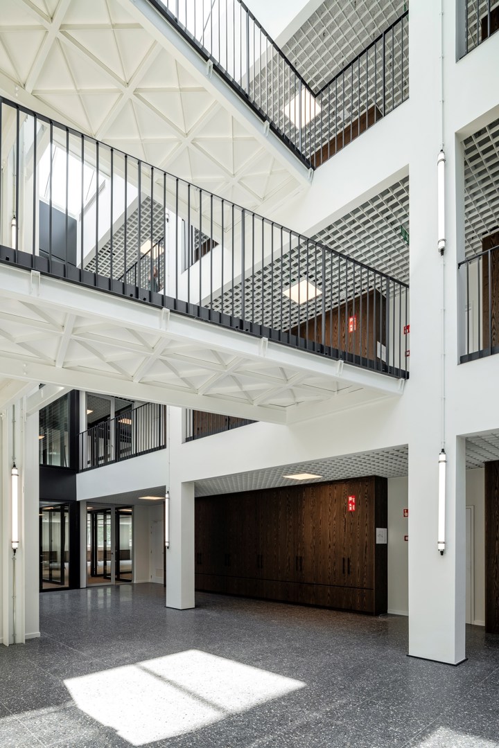 Bij elke ontwerpbeslissing hielden de architecten rekening met de impact ervan op de medewerkers. Om een aangename werkomgeving te creëren, organiseerden ze het centrale gebouw volledig in het groen, samen met DELVA Landscape Architecture & Urbanism, en ontwierpen ze verschillende werkplektypes.
