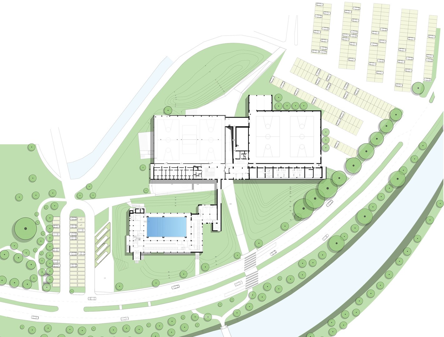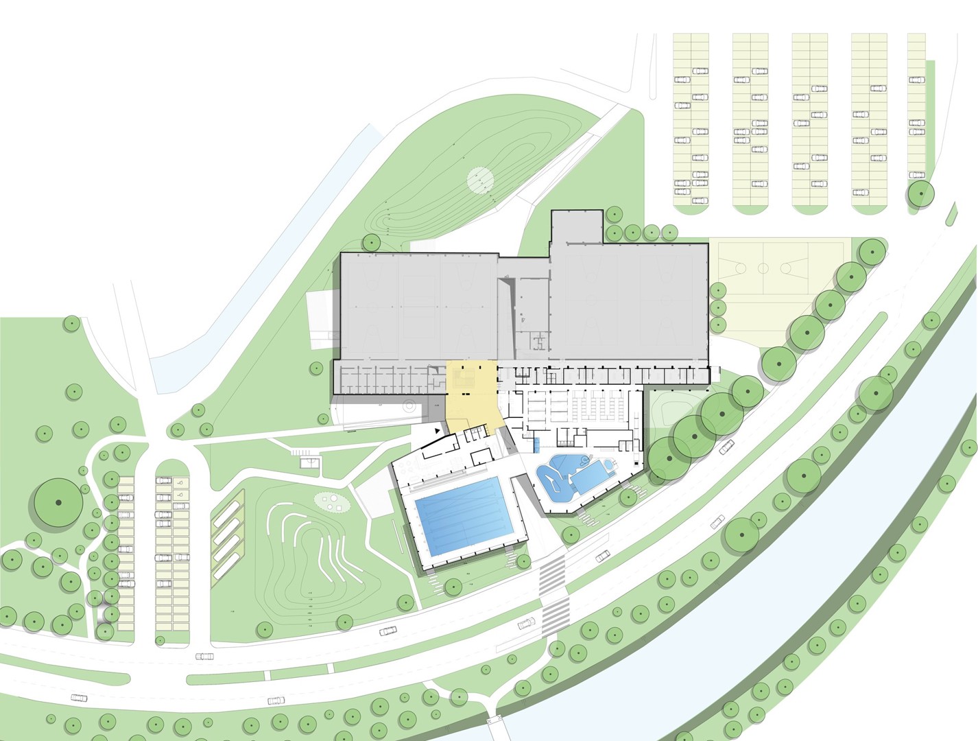 De horecagelegenheid in het ontwerp van B2Ai architecten en VenhoevenCS versterkt de connectie tussen binnen en buiten, met een voorplein dat met niveauverschillen en speelelementen ook buiten uitnodigt tot spel en ontmoeting. De voorheen versnipperde ruimte rond het complex pakken de ontwerpers ook aan en vormt straks een aangenaam groen en publiek geheel. Het park zal ook kunnen worden ingezet tijdens de Lokerse Feesten en deel uitmaken van het hele Feestenparcours. "Ik zie het al helemaal voor me: straks zit je op de rand van het zwembad en ben je omringd door de groene bomen in het park", droomt Manfred Wansink, architect en partner bij VenhoevenCS al over het eindresultaat. "Je ziet de fietsers die onder het complex doorrijden, maar ook de sporters in de andere delen van het gebouw.”