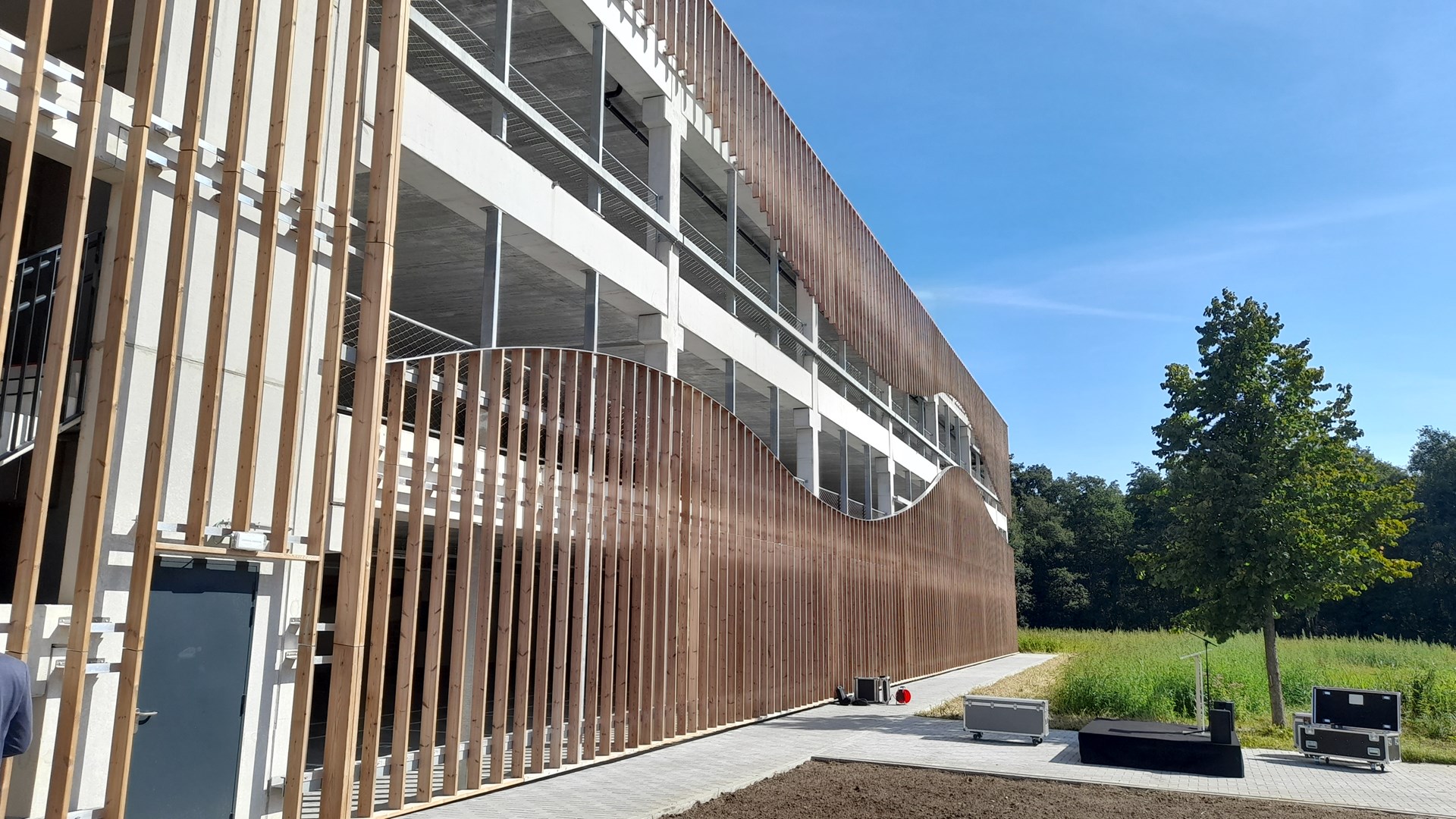 Ook in andere opzichten is het nieuwe parkeergebouw duurzaam en toekomstgericht. Zo werd het grotendeels opgetrokken boven op de bestaande parkeerverharding en is de ruimtelijke footprint minimaal – zelfs bij een eventuele uitbreiding en capaciteitsverhoging – waardoor er meer plaats overblijft voor omringend groen. Dit komt de landschappelijke integratie ten goede, net als de keuze voor een opmerkelijke houten gevelbekleding. “Het verticaal houten latwerk, dat is opgehangen aan de betonnen structuur, resulteert in een expressieve dynamiek. Bovendien zijn de houten gevelelementen volledig demonteerbaar en kunnen ze nadien elders toegepast worden, conform het product as a service-principe. De focus op circulariteit leidde tevens tot de opmaak van een materialenpaspoort, wat de traceerbaarheid en herbruikbaarheid van de toegepaste materialen moet bevorderen. Tot slot is het complex uitgerust met elektrische laadpunten, energiezuinige ledverlichting en binnenkort ook met zonnepanelen. We hebben boven op het dak alvast een staalstructuur met de juiste helling en oriëntatie voorzien, zodat er een PV-installatie kan worden geplaatst waar ook de andere toekomstige gebouwen op de campus gebruik van zouden kunnen maken”, legt Gunther Segers uit.